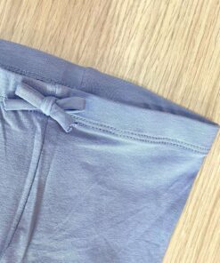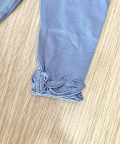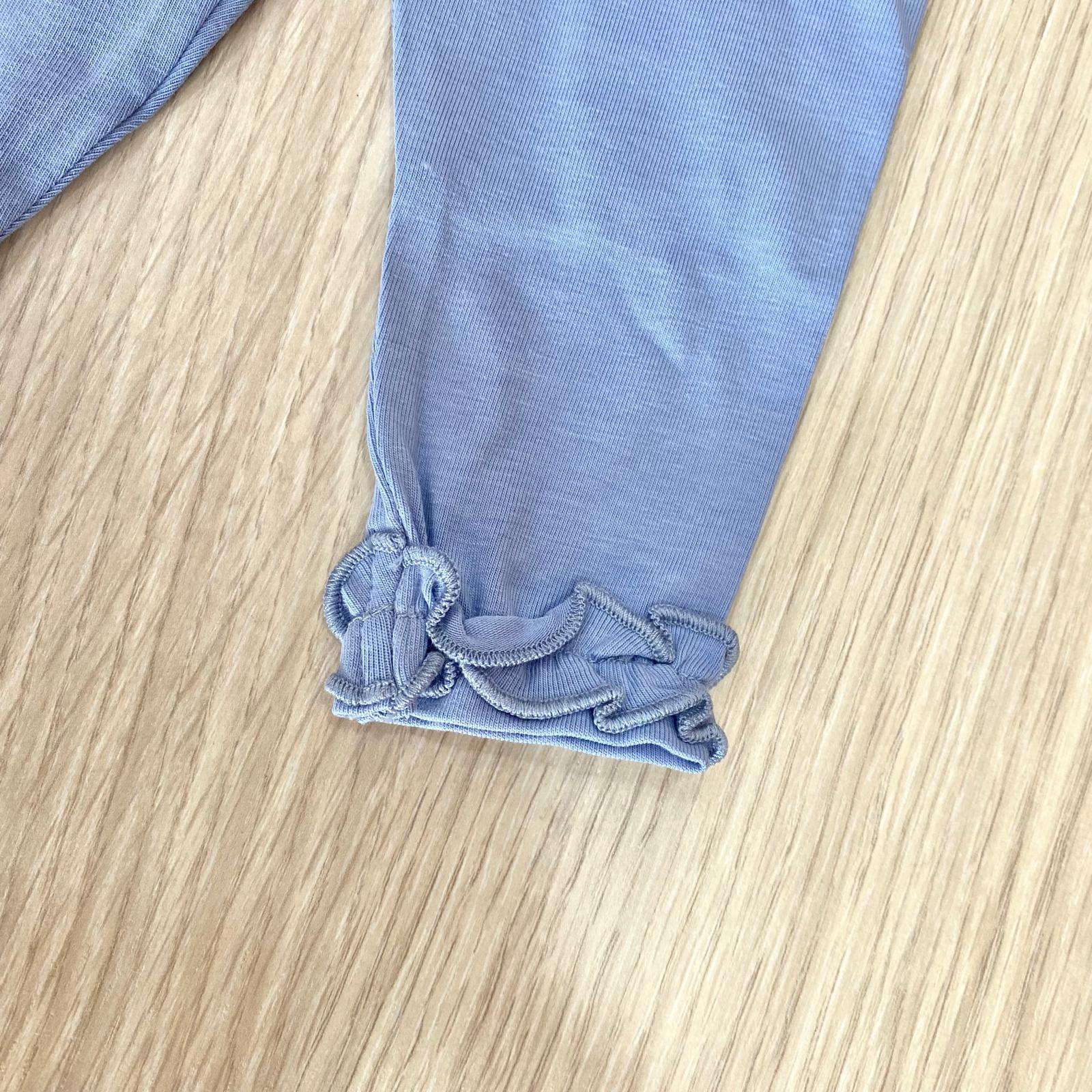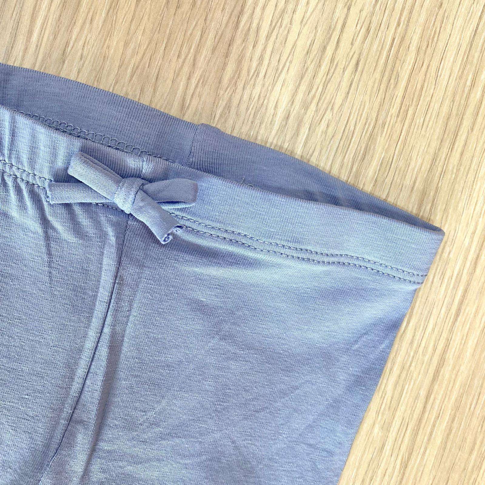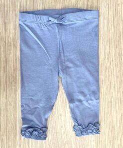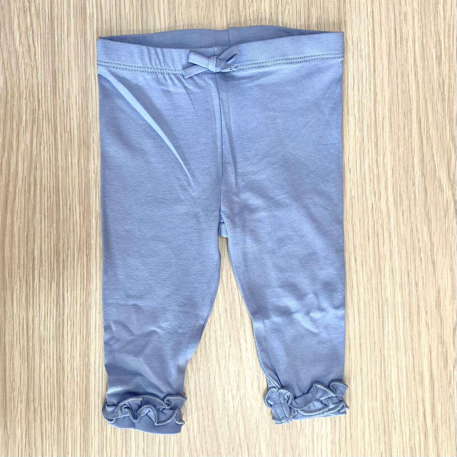 Leggings neonata/bambina in cotone elasticizzato, di colore celeste, con dettaglio di fiocchetto in tessuto  e rifinitura alla caviglia con doppia balza arricciata.