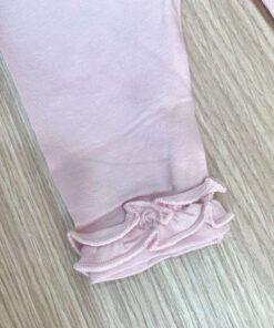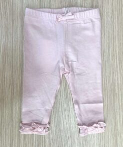 Leggings neonata/bambina in cotone elasticizzato, di colore rosa chiaro, con dettaglio di fiocchetto in tessuto  e rifinitura alla caviglia con doppia balza arricciata.