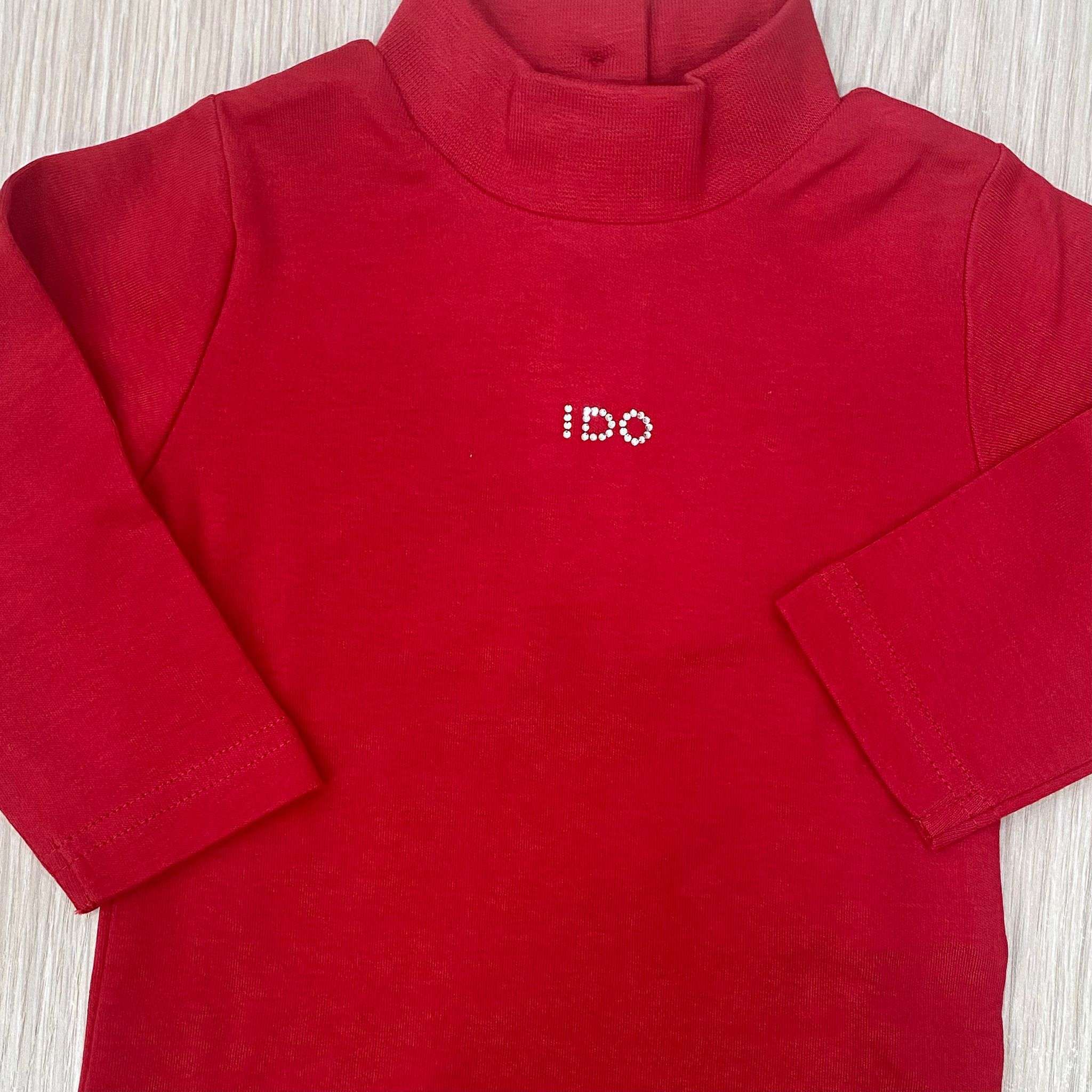 Maglia a lupetto bambino/a in caldo cotone, di colore rosso, con logo I DO in swarovski.