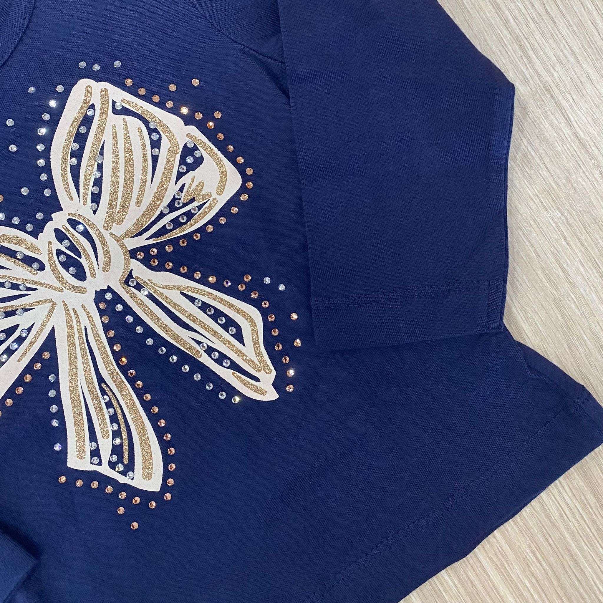 Maglia bambina in caldo cotone, di colore blu, con stampe di vari colori e applicazioni di strass.