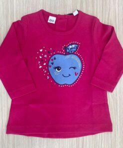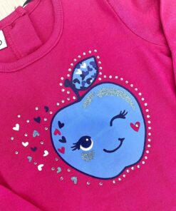 Maglia bambina in caldo cotone, di colore fucsia, con stampe di vari colori e applicazioni di strass.