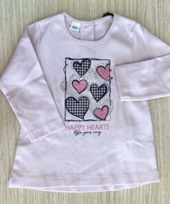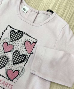 Maglia bambina in caldo cotone, di colore rosa chiaro, con stampe di vari colori e applicazioni di strass.