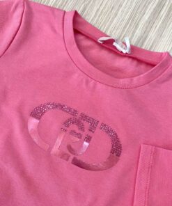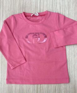 Maglia bambina in cotone, di colore rosa, con stampa laminata rosa e applicazione di strass.