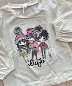 Maglia bambina in cotone, di colore panna, con stampa di vari colori e applicazione di strass. Maglia con manica a sbuffo.