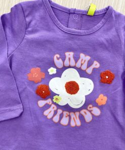 Maglia bambina in cotone, di colore lilla, con disegno di vari colori e dettaglio in rilievo.