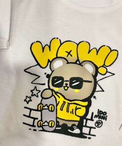 Maglia in cotone, di colore bianco, con stampe di vari colori, apertura con bottoncini sul collo.