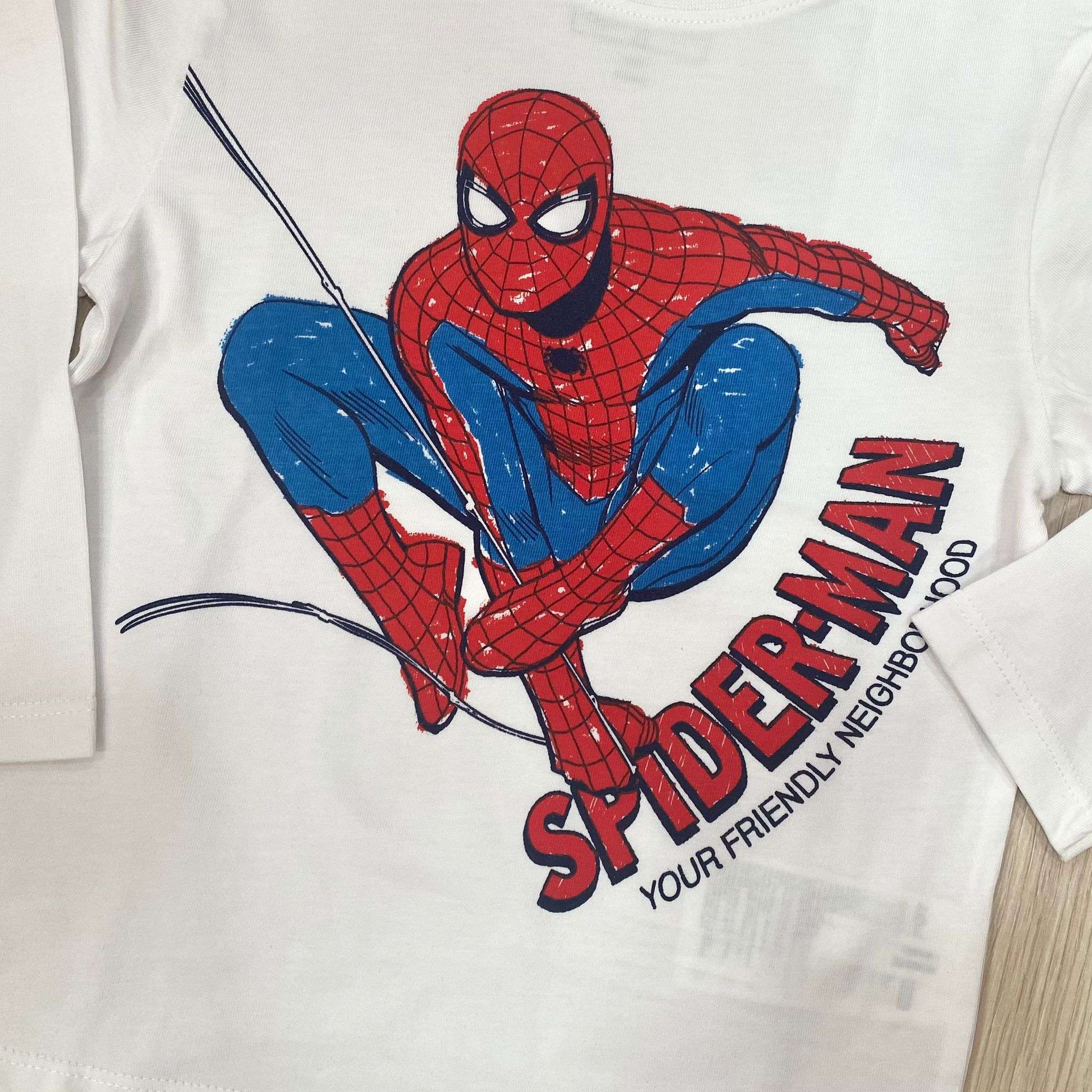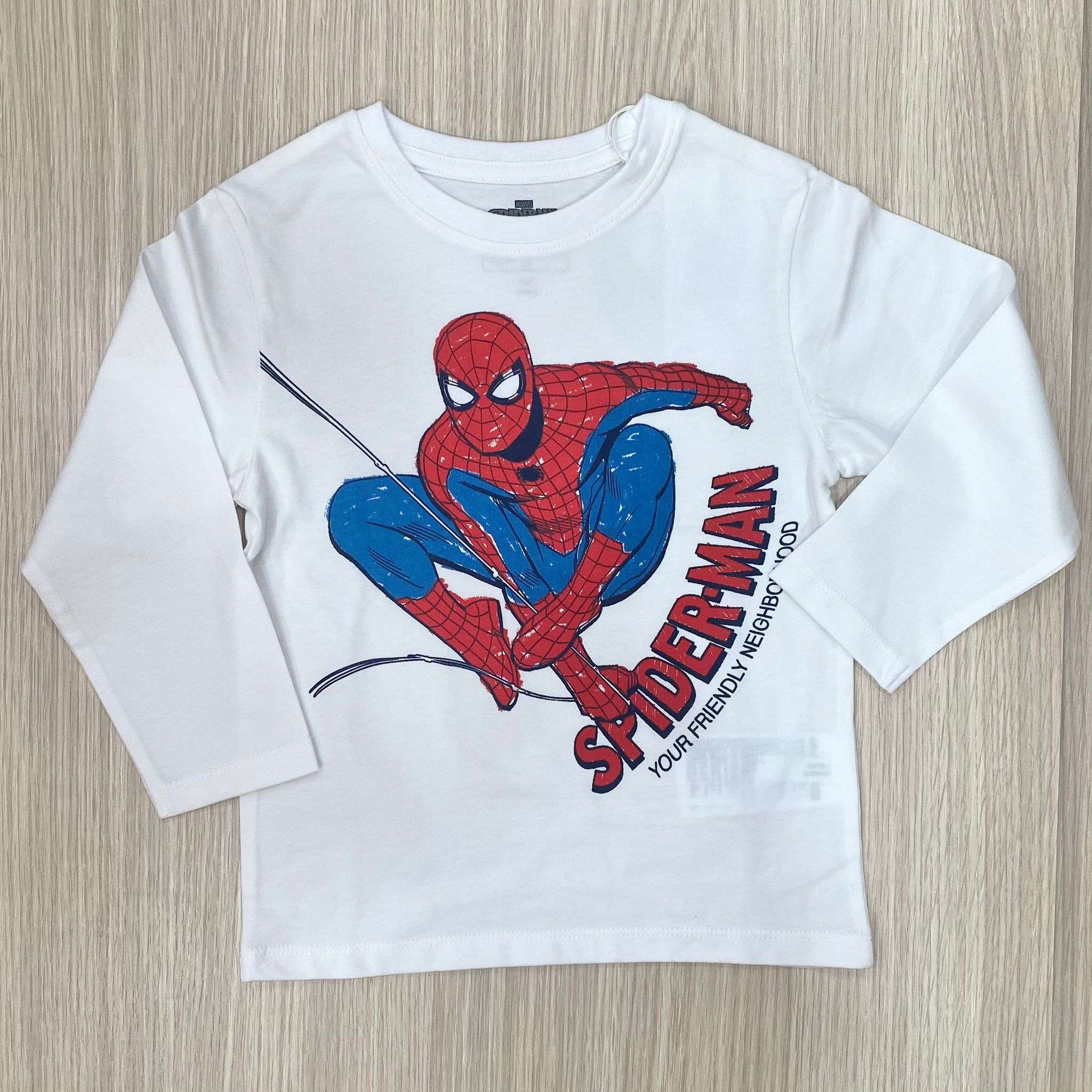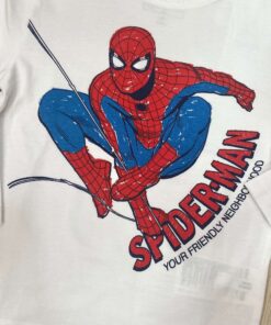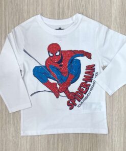 Maglia bambino in cotone, di colore bianco, con stampa Spider-Man di vari colori.