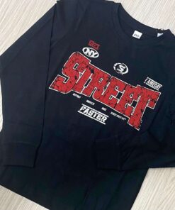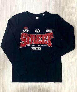 Maglia a manica lunga in cotone nero, dal design urbano e sportivo. Sul fronte spicca una stampa grafica effetto vintage con scritta centrale “STREET” in stile distressed, arricchita da dettagli e lettering ispirati alla cultura street di New York. Il contrasto dei colori rosso e beige dona carattere e dinamicità al capo.