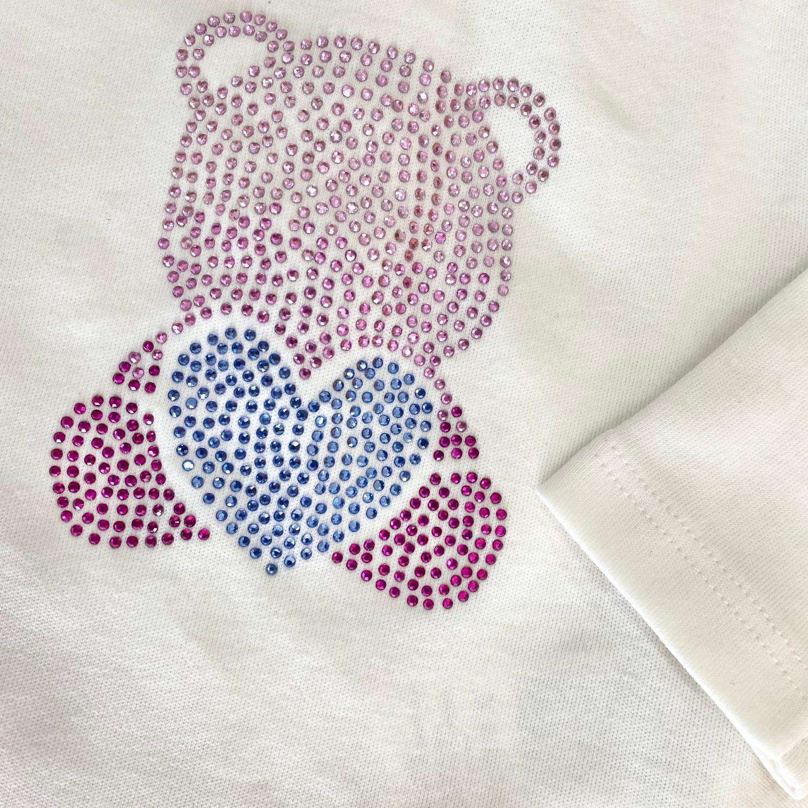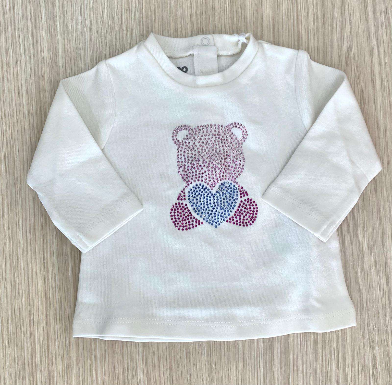 Maglia neonata/bambina in caldo cotone, di colore panna, con strass di vari colori.