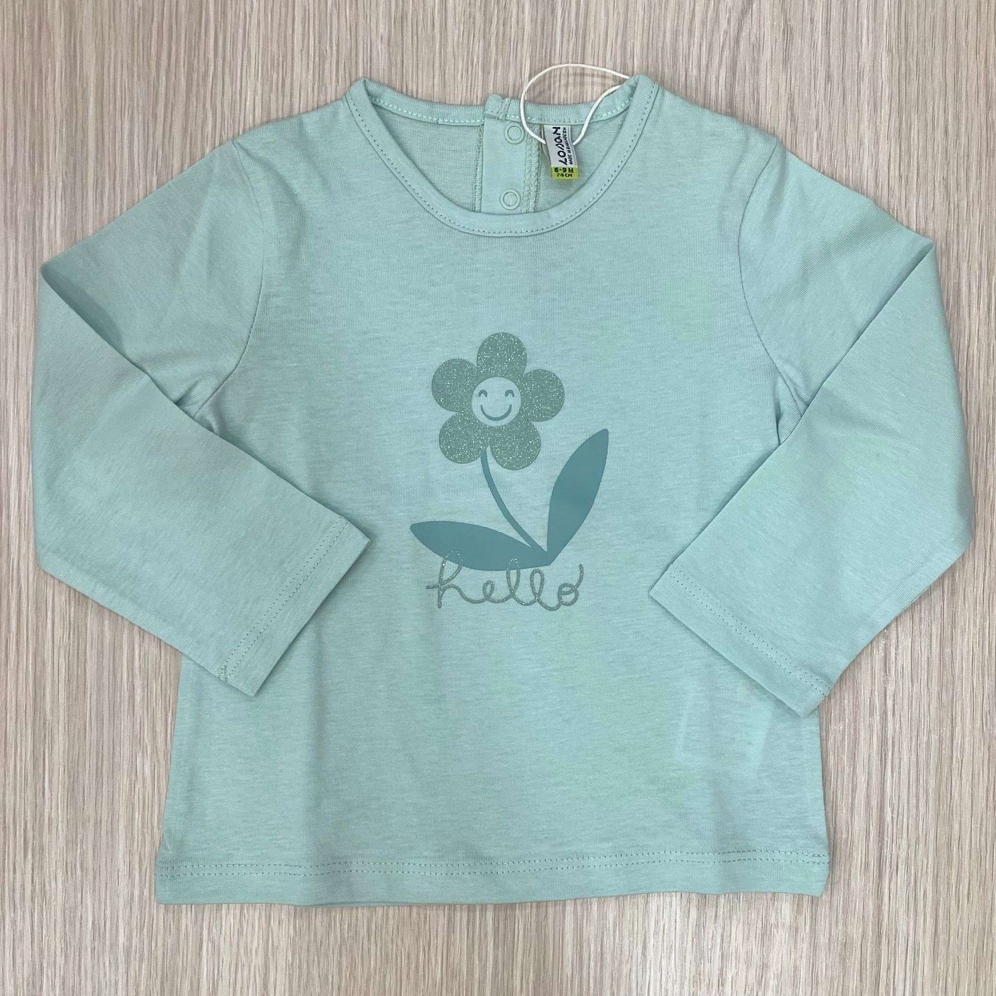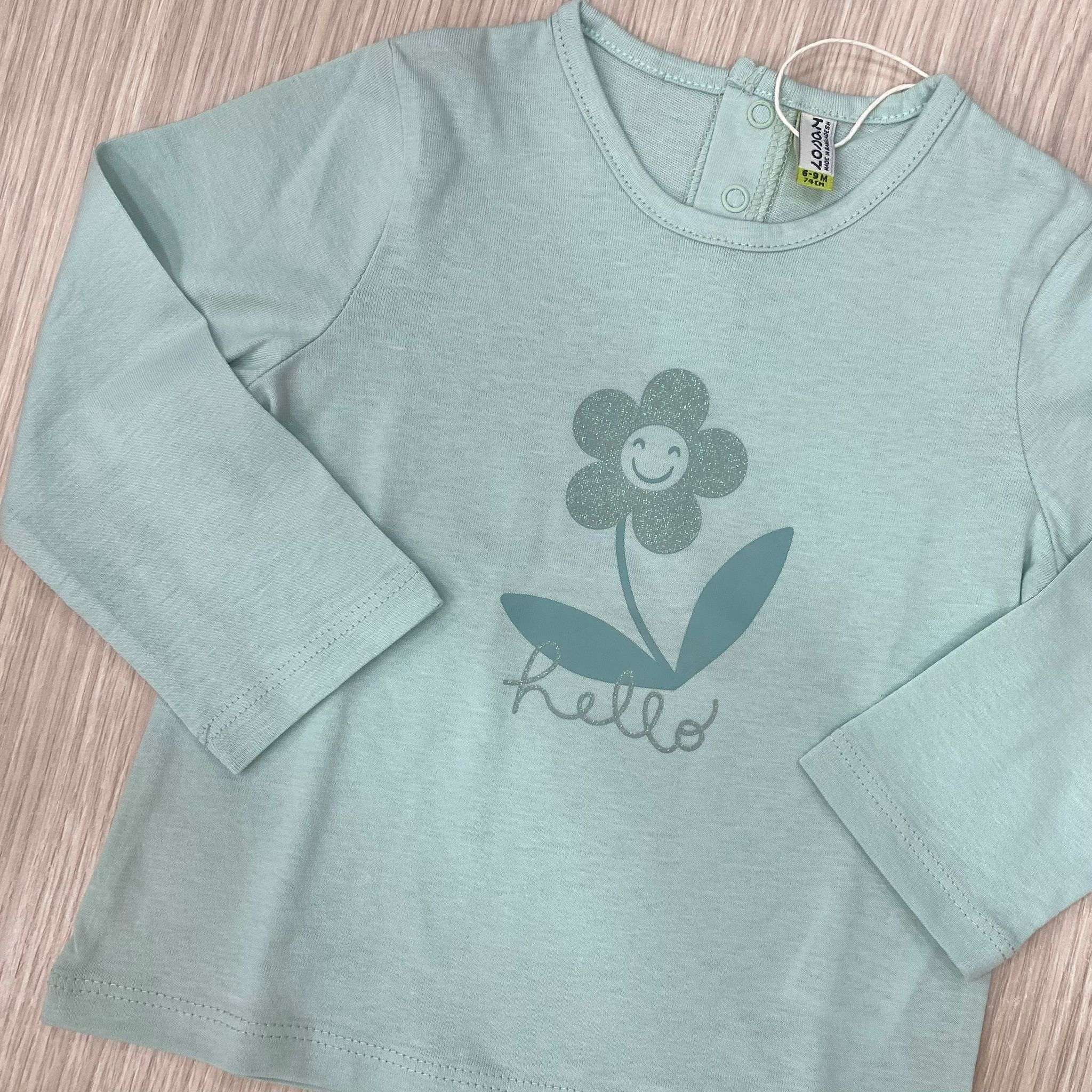 Maglia neonata/bambina in cotone, di colore verde acqua, con scritta e dettagli di disegno glitterati.