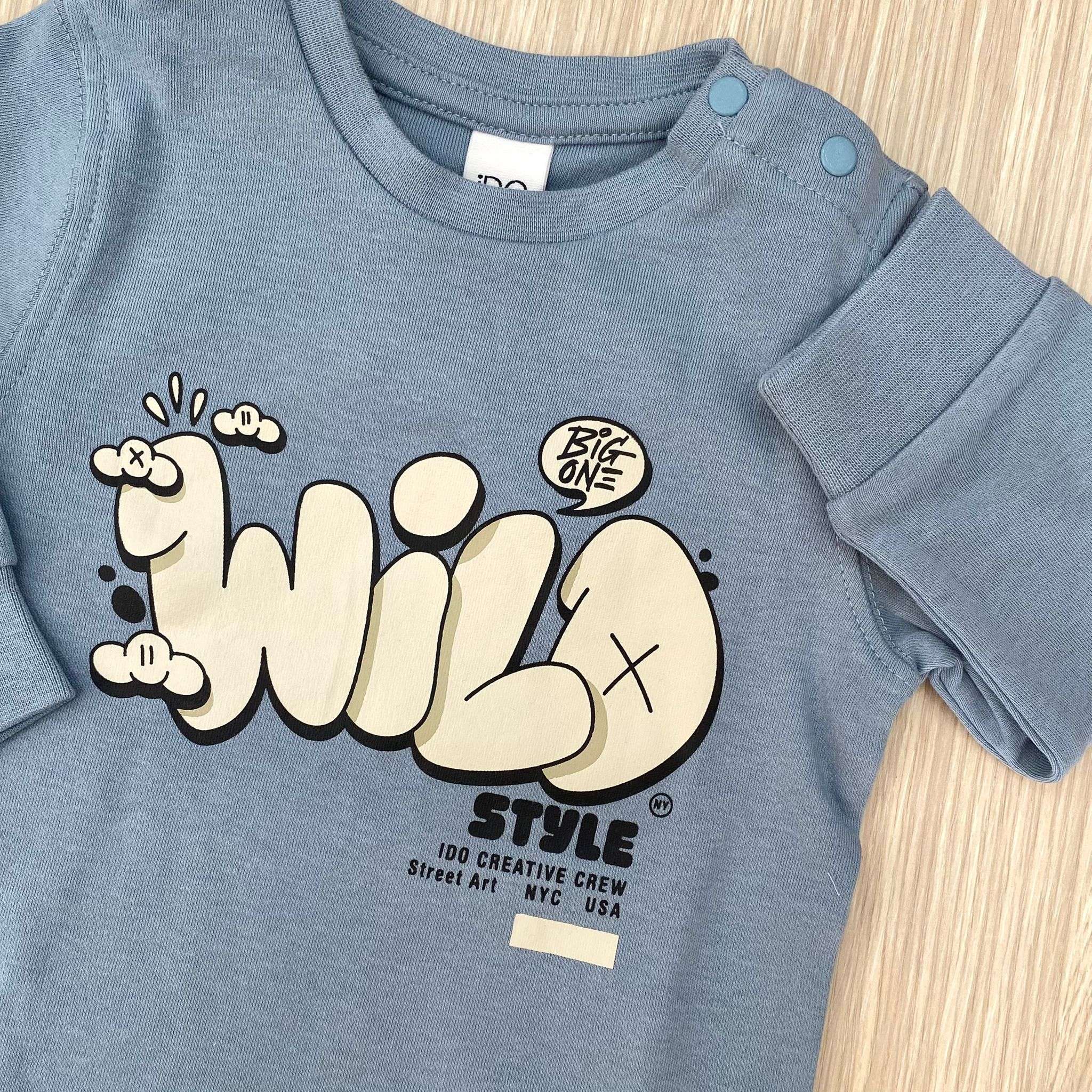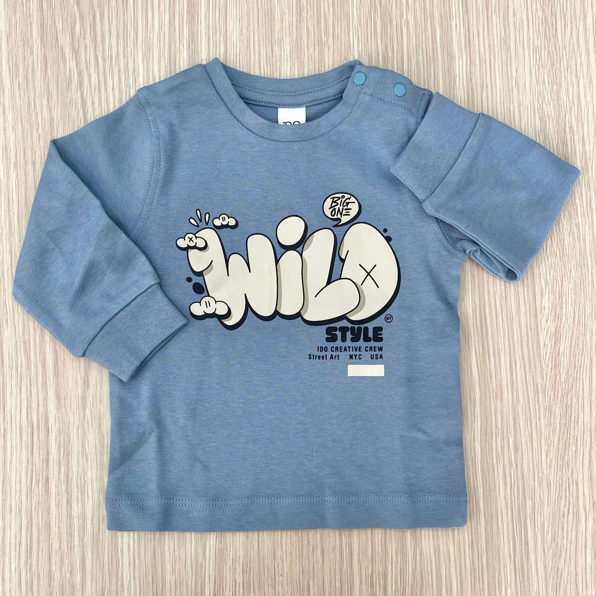 Maglia bambino in caldo cotone, di colore azzurro, con stampe di vari colori.