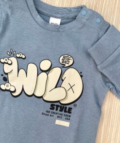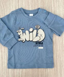 Maglia bambino in caldo cotone, di colore azzurro, con stampe di vari colori.