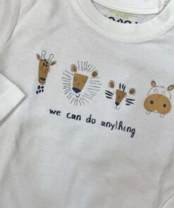 Maglia neonato/bambino in cotone, di colore panna, con scritta e disegni di colore tortora e blu.