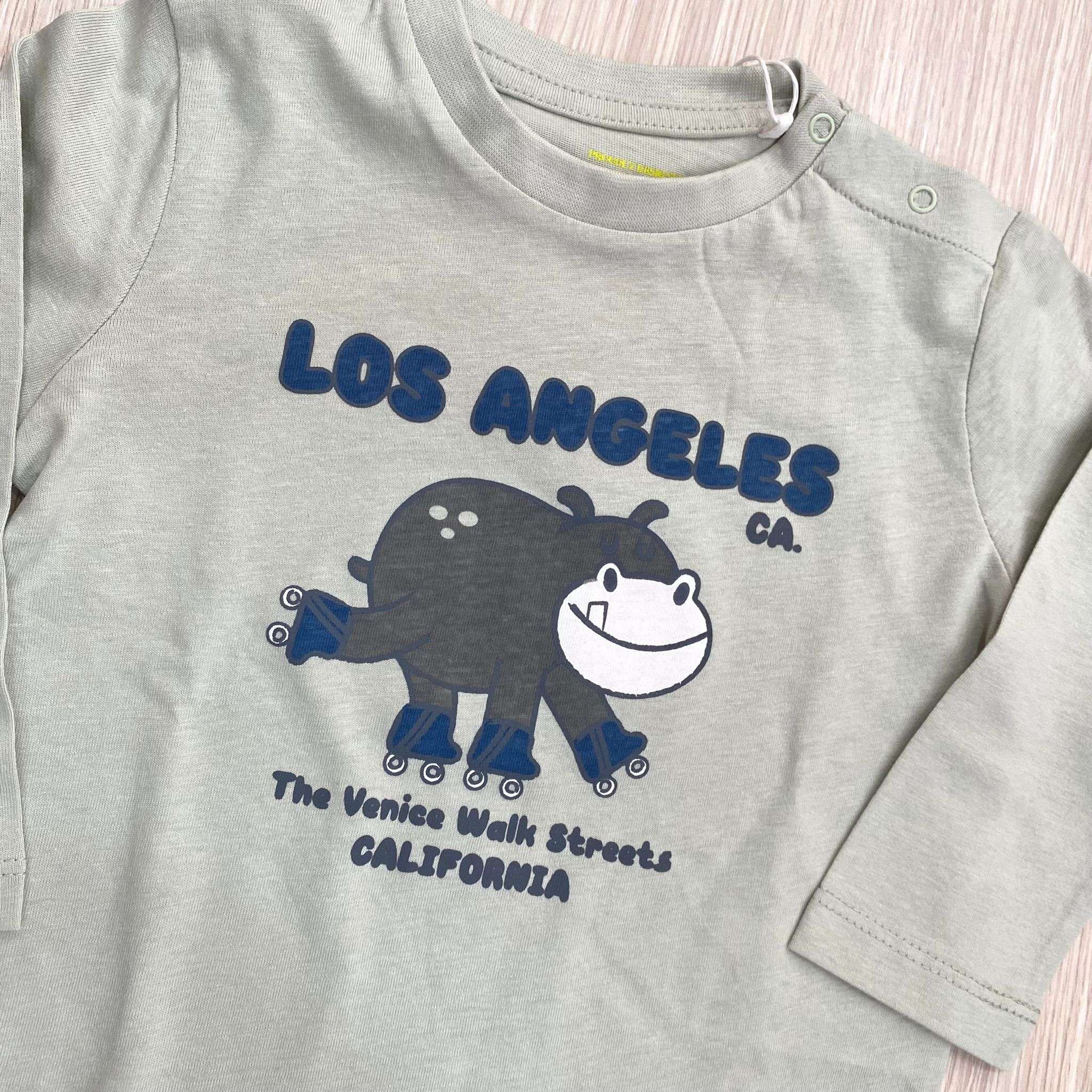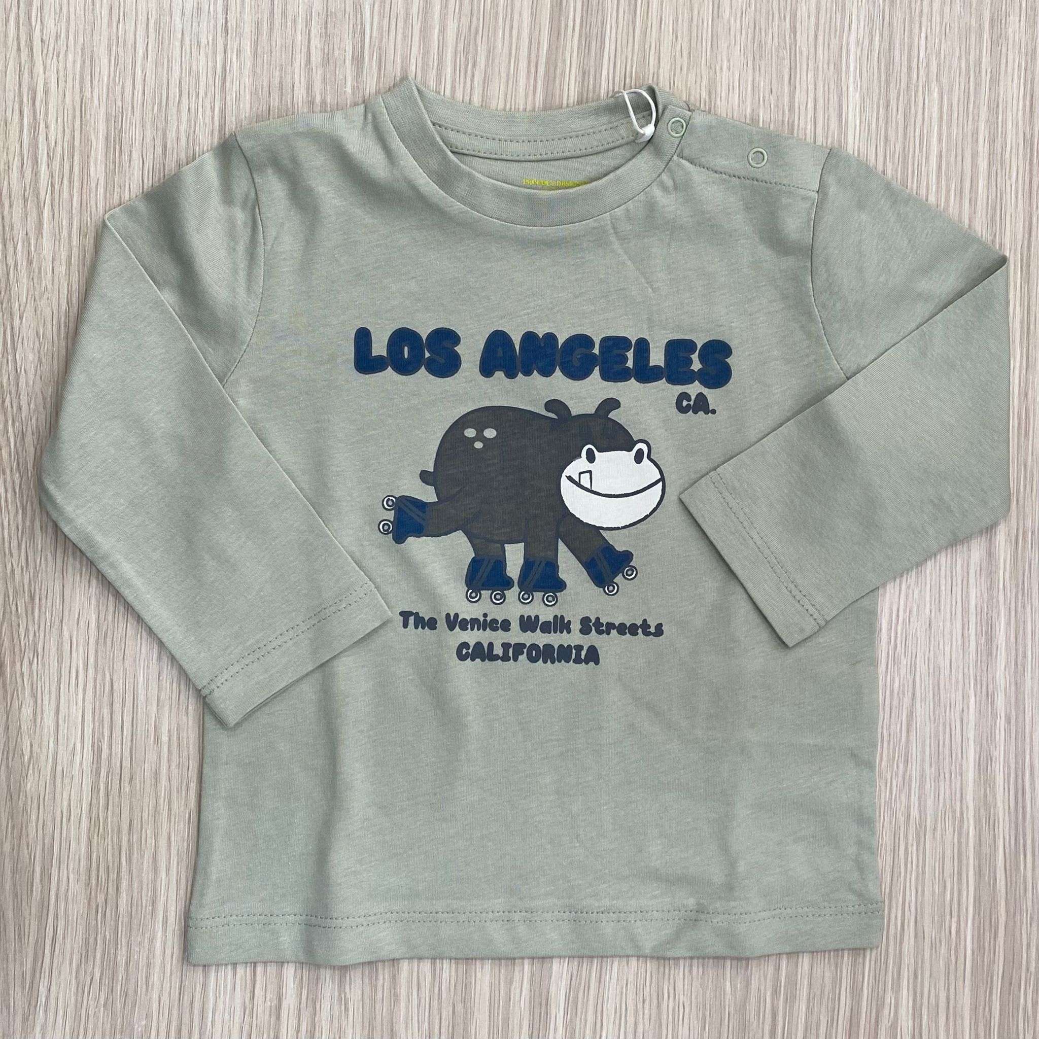 Maglia neonato/bambino in cotone, di colore verde chiaro, con scritta e disegni di vari colori.