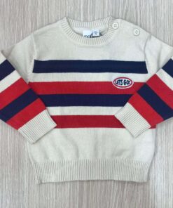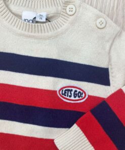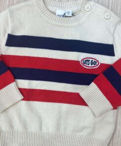 Maglioncino bambino in caldo cotone, di colore ecrù, rosso e blu, con dettaglio di scritta in rilievo.