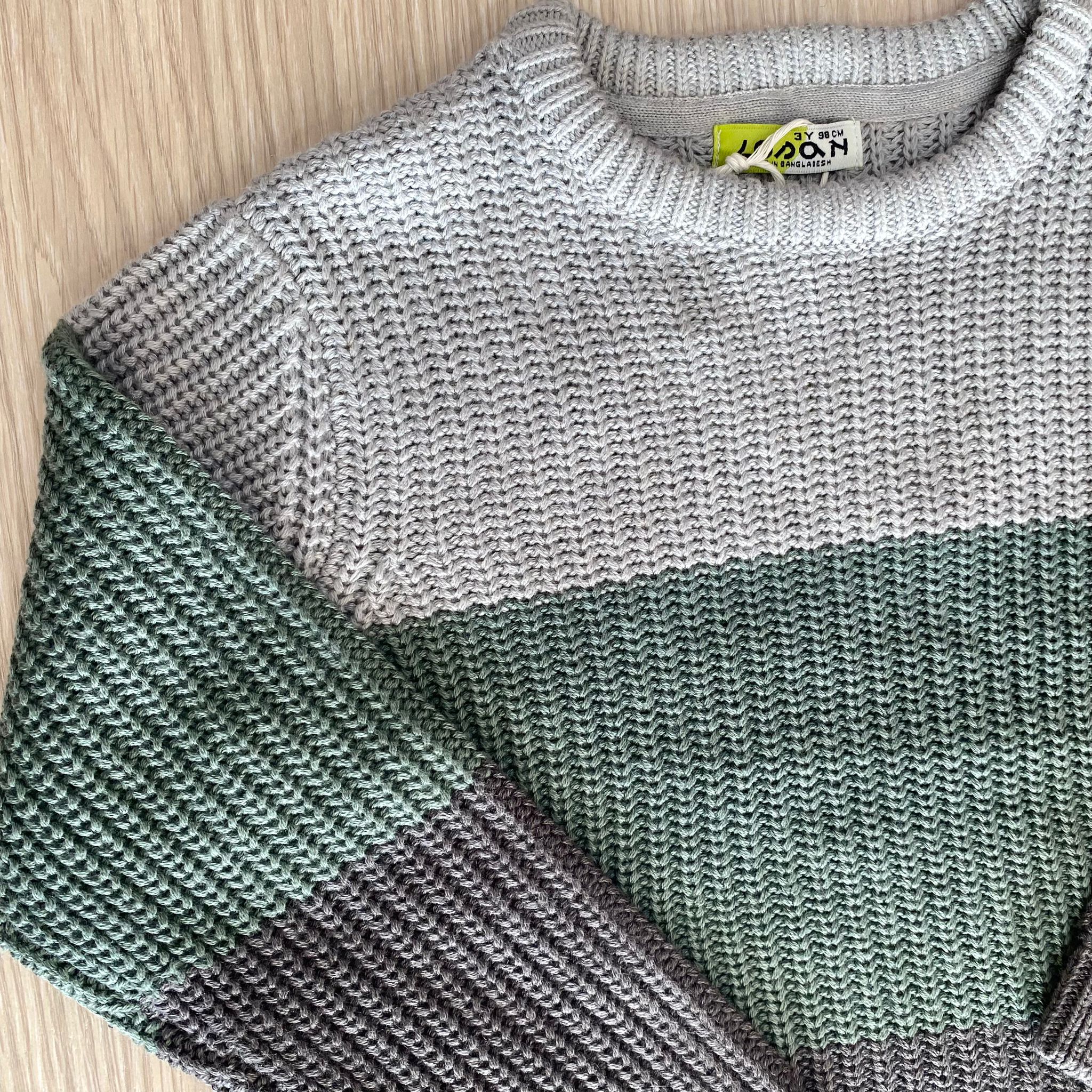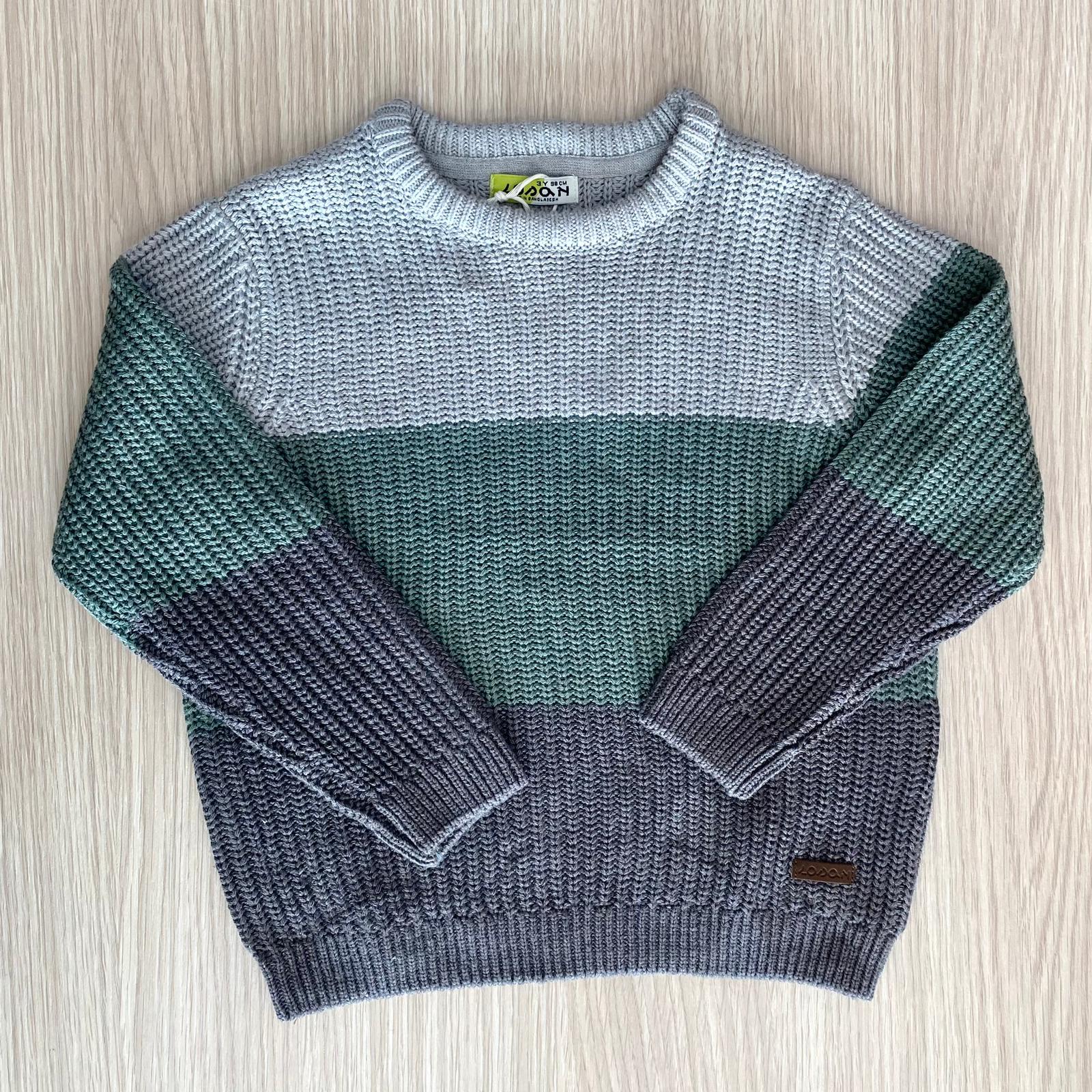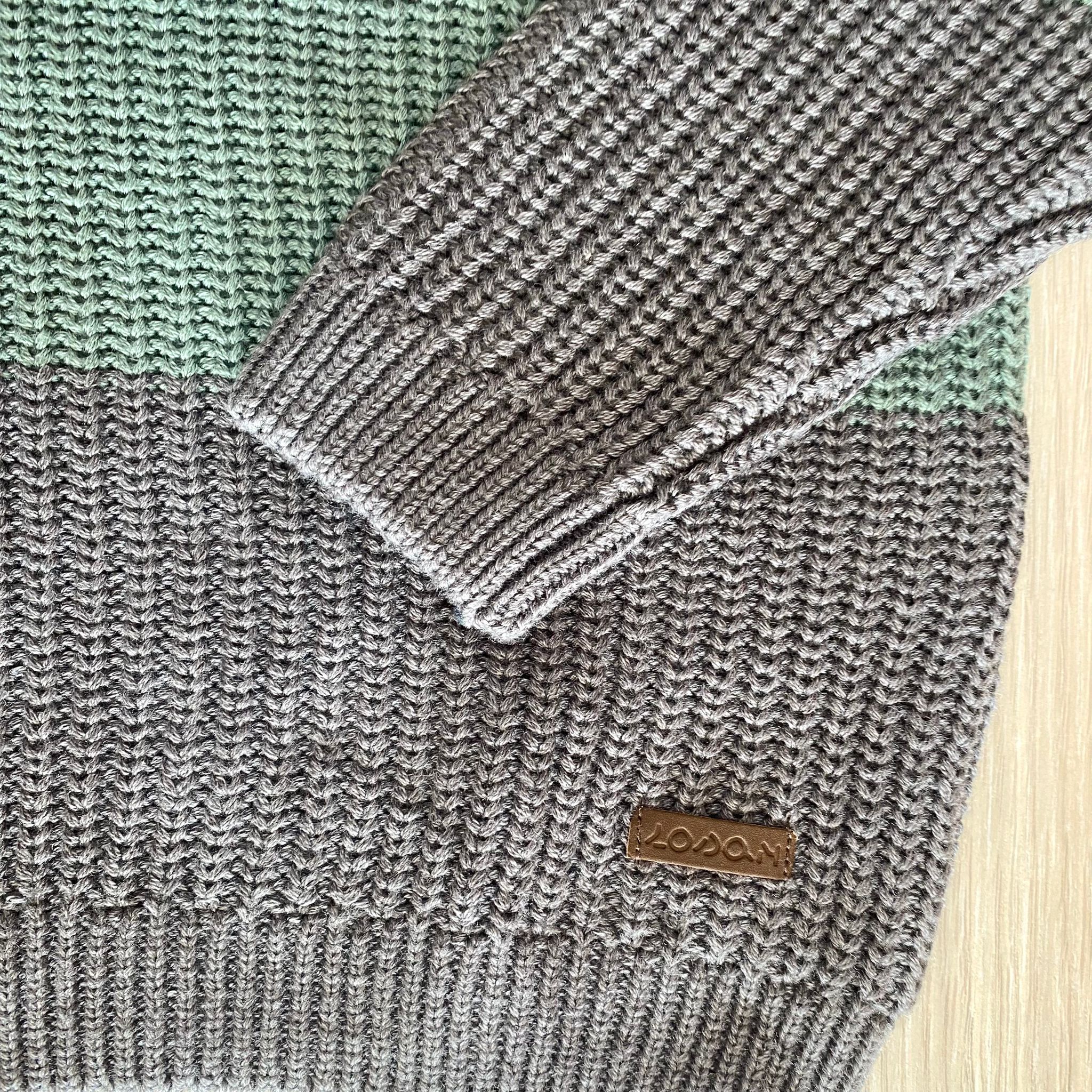 Maglioncino bambino in caldo cotone, di colore verde e grigio.