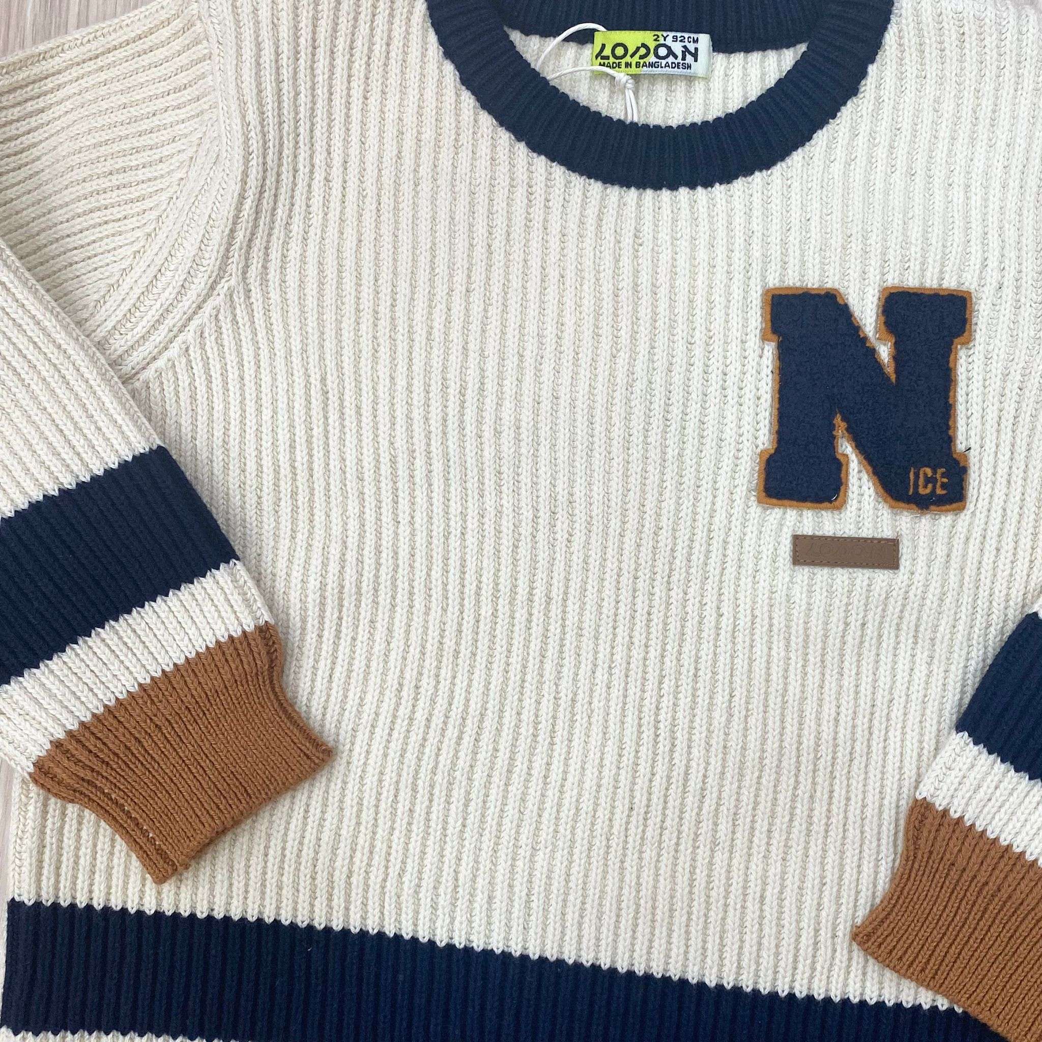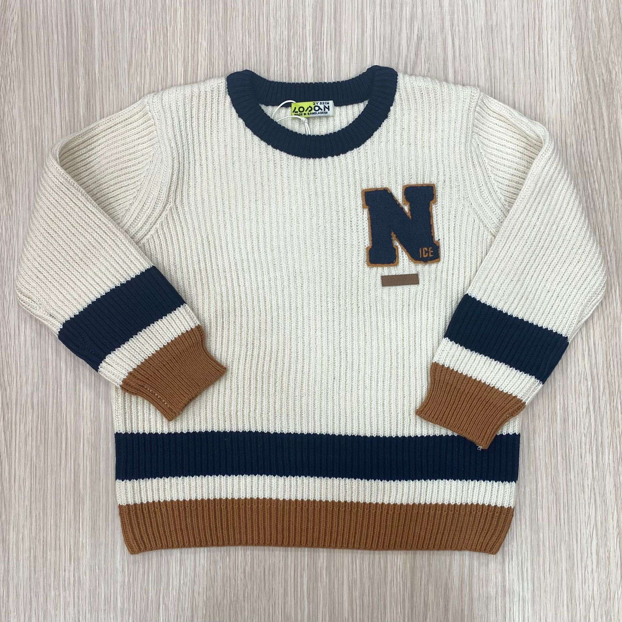 Maglioncino bambino in caldo cotone, di colore ecrù, marroncino e blu, con dettaglio in rilievo.