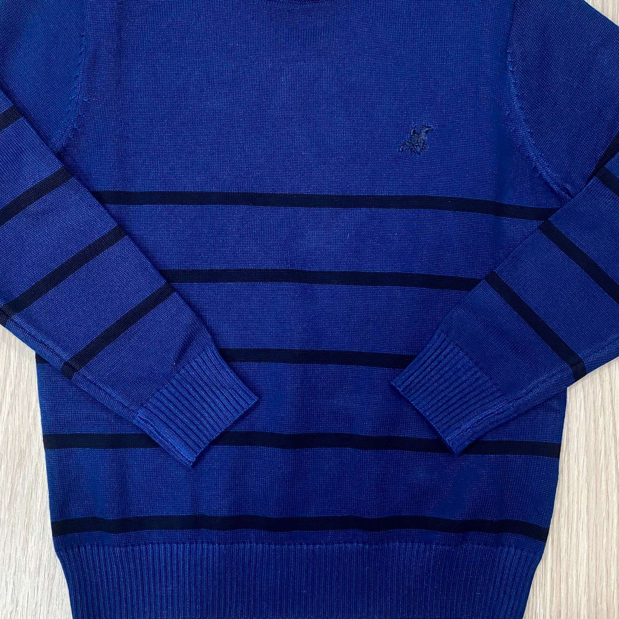 Maglioncino rasato bambino in caldo tessuto di colore blu e blu notte. Maglioncino con logo ricamato di colore blu.