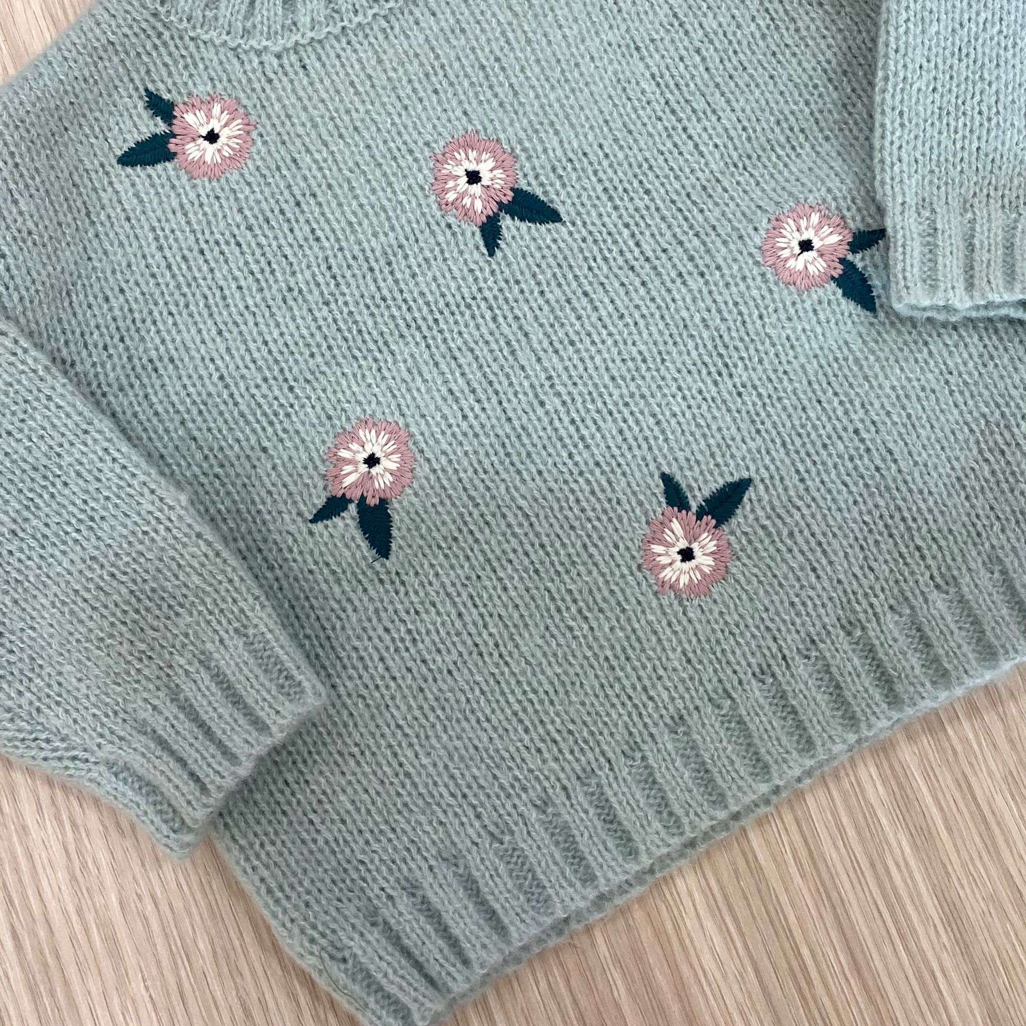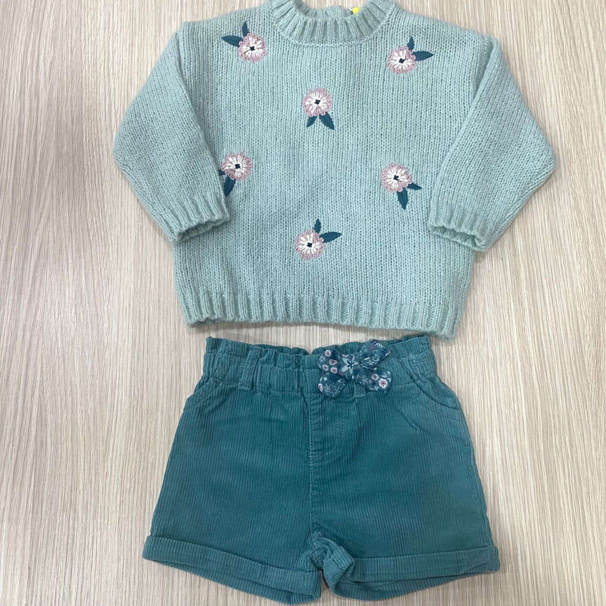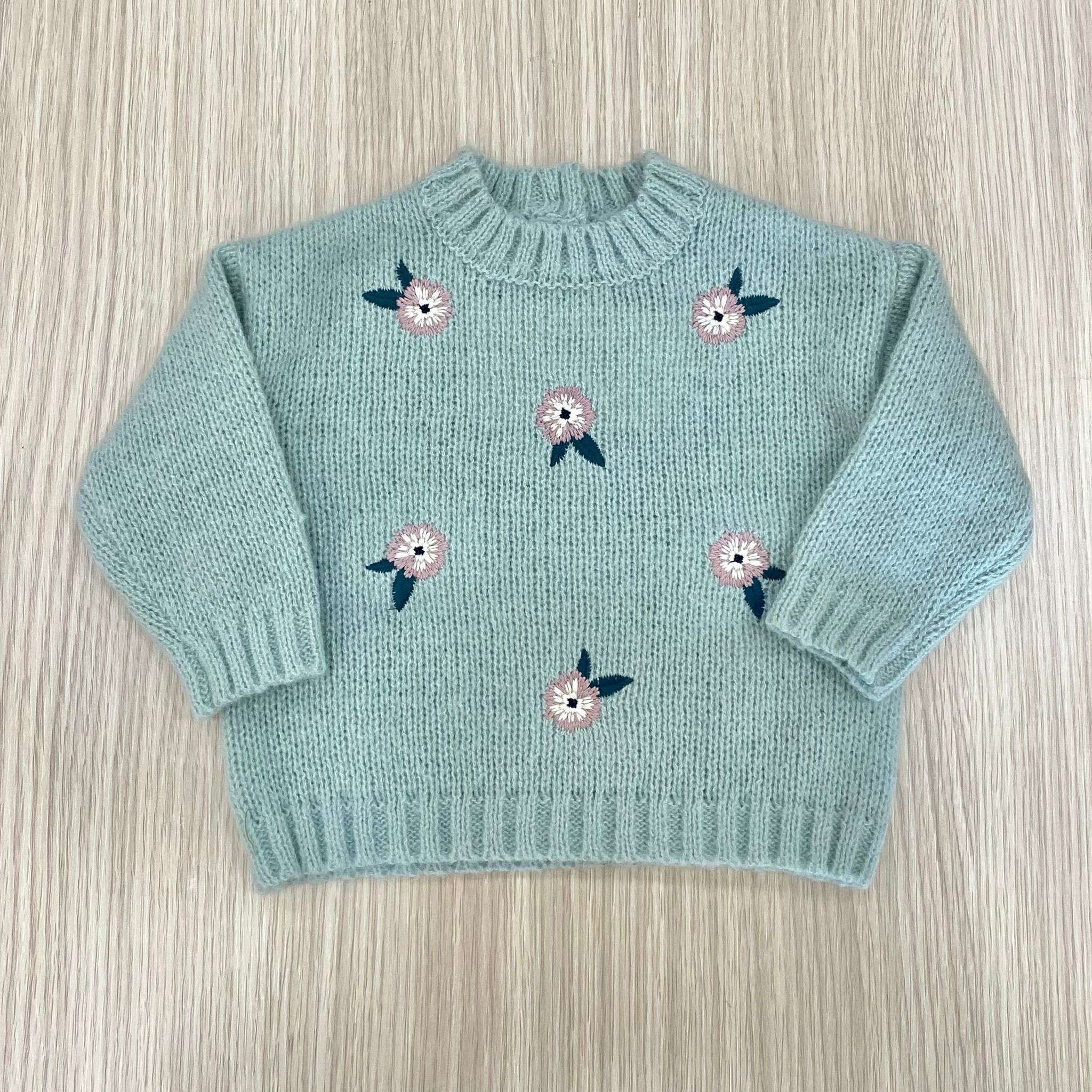 Maglioncino neonata/bambina in caldo tessuto, di colore verde chiaro, con disegno ricamato.