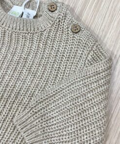 Maglioncino neonato/bambino in caldo cotone misto lana, di colore beige, con dettaglio di bottoncini sul collo.