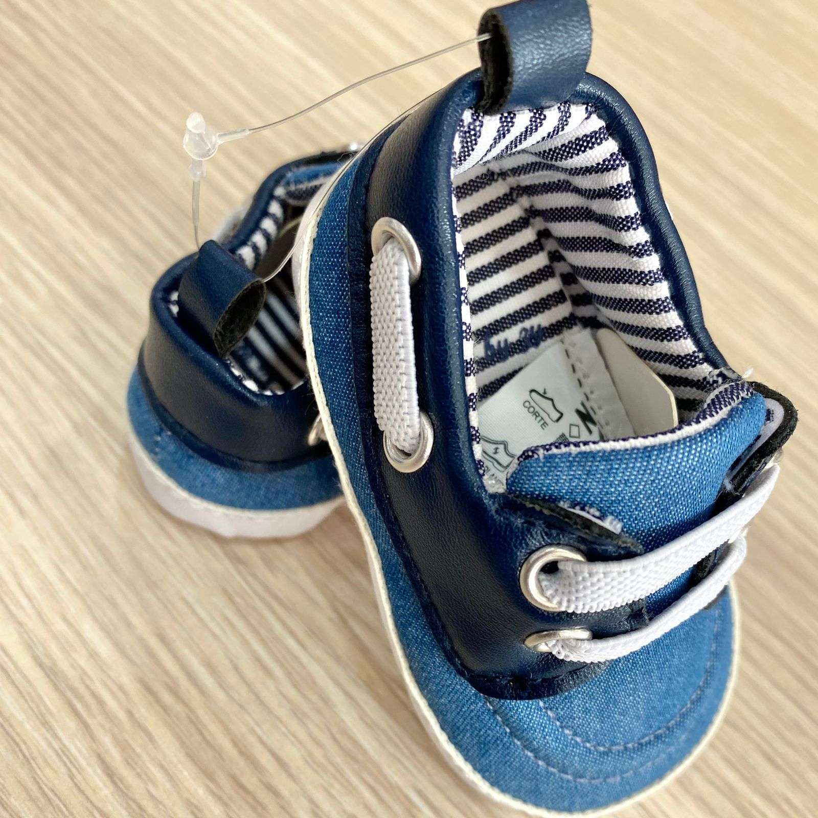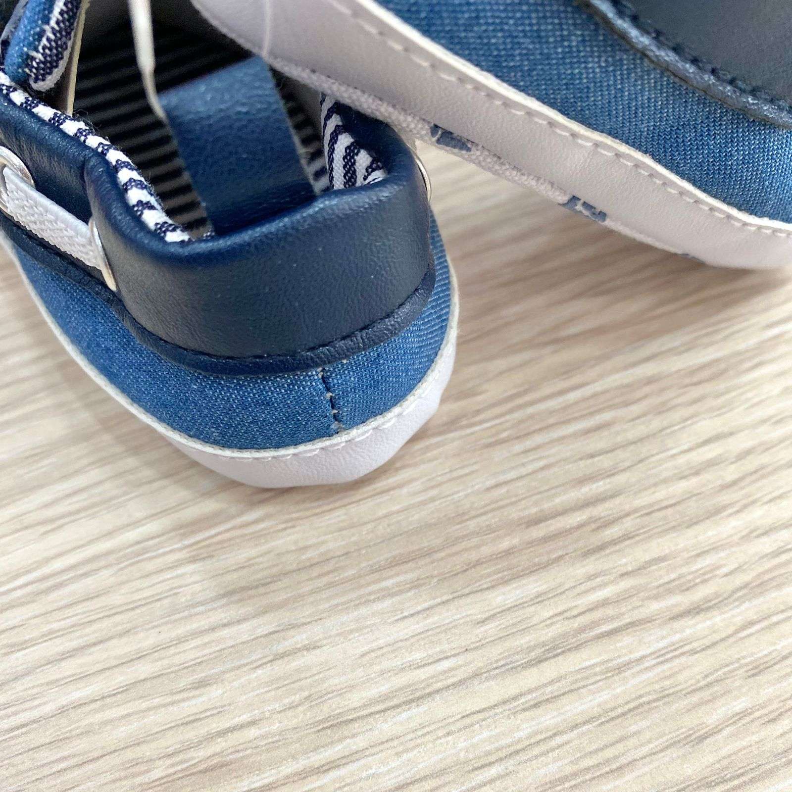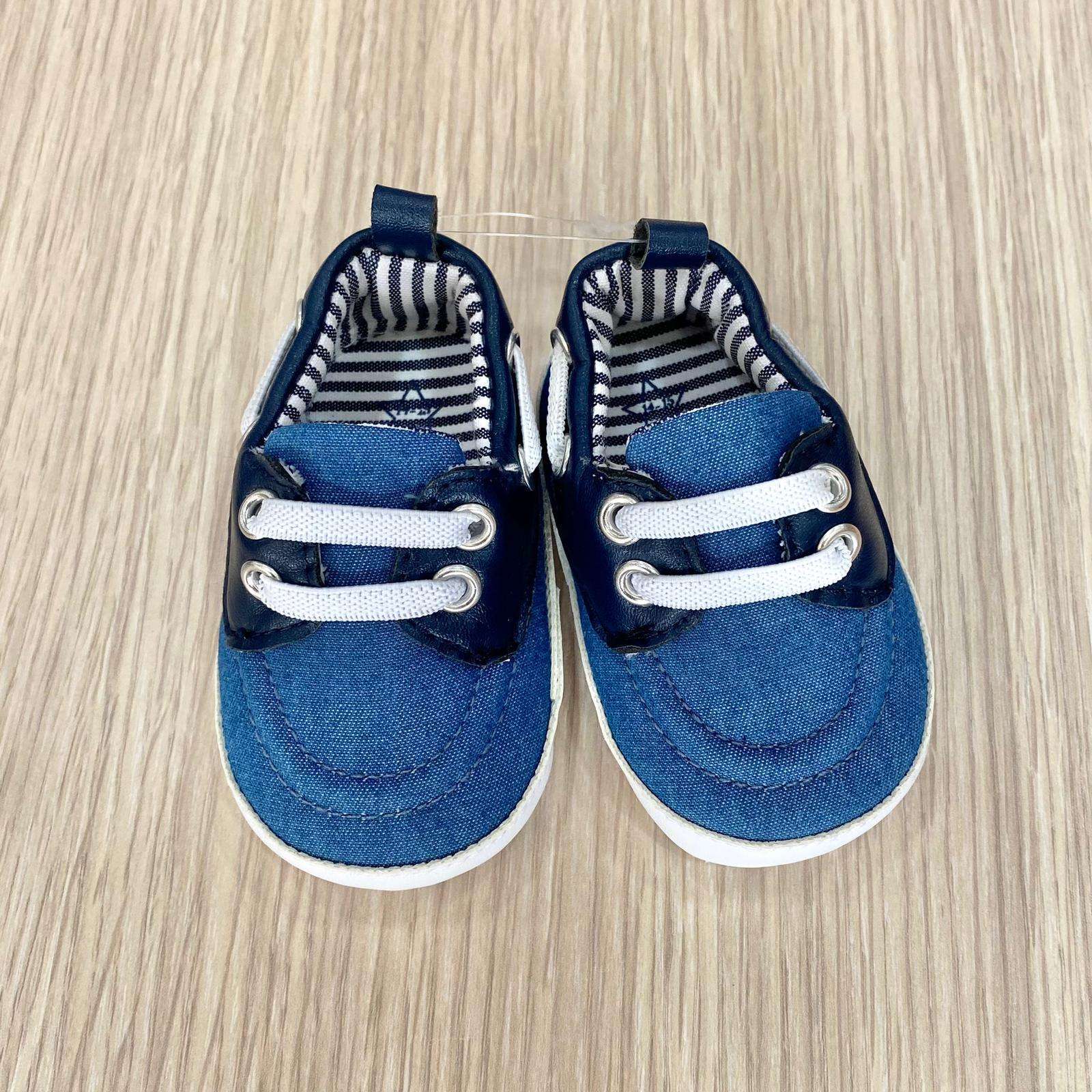 Mocassino neonato/bambino in cotone, di colore denim, con laccetti elastici regolabili. Mocassino con dettaglio antiscivolo.