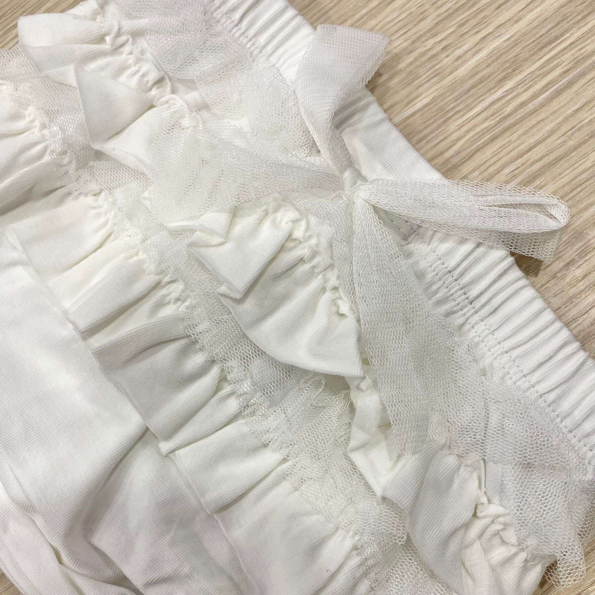 Mutandina copripannolino neonata/bambina in cotone elasticizzato, di colore panna, con balze a riccetto alternate con tulle e applicazione di fiocchetto centrale.