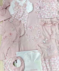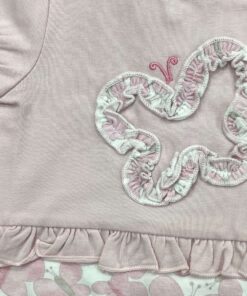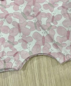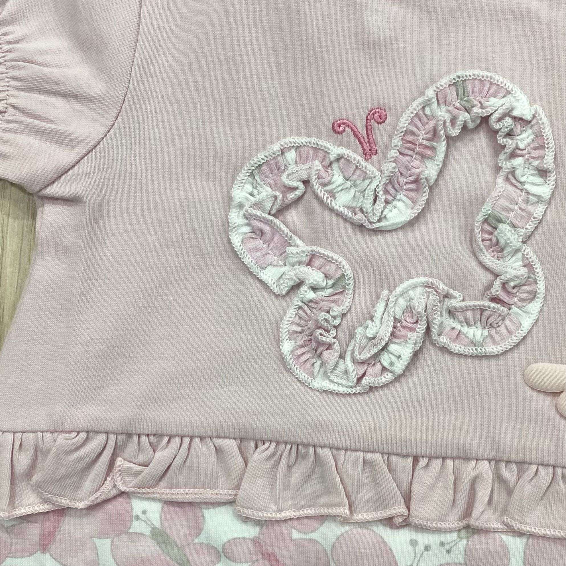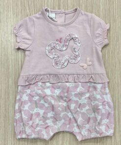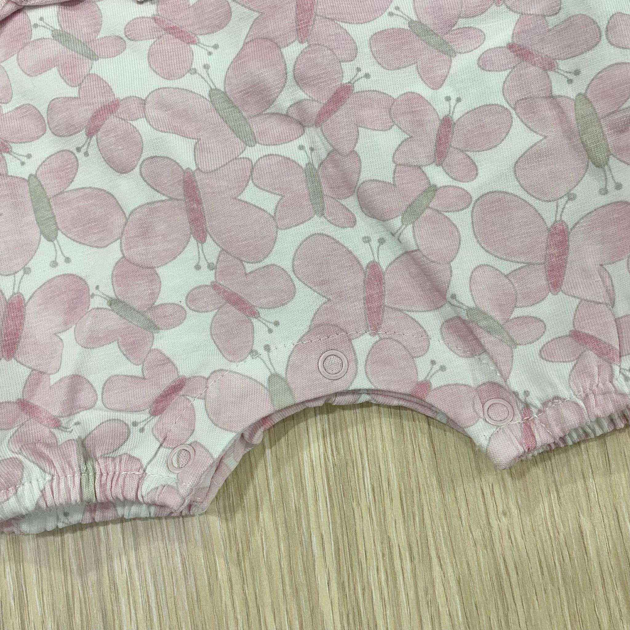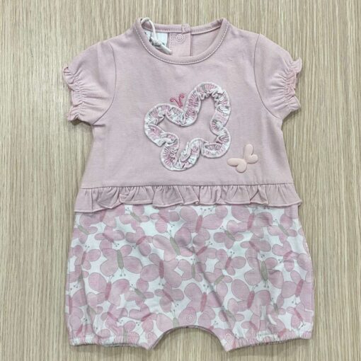 Pagliaccetto neonata in cotone, di colore rosa e bianco, disegno in rilievo e applicazione di farfallina.
