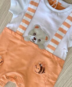 Pagliaccetto neonato/a/bambino/a in cotone, di colore bianco e arancione, con dettagli di finta salopette e disegni ricamati.