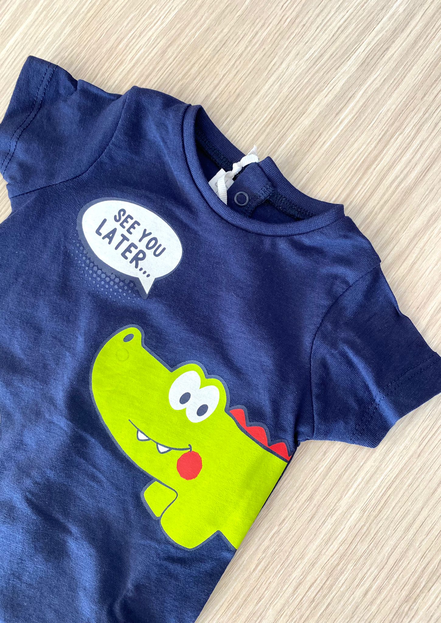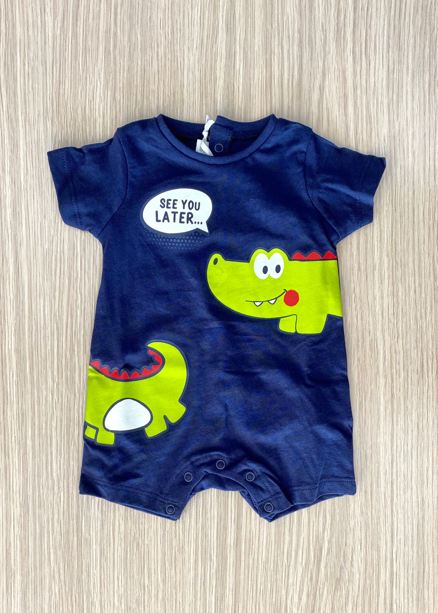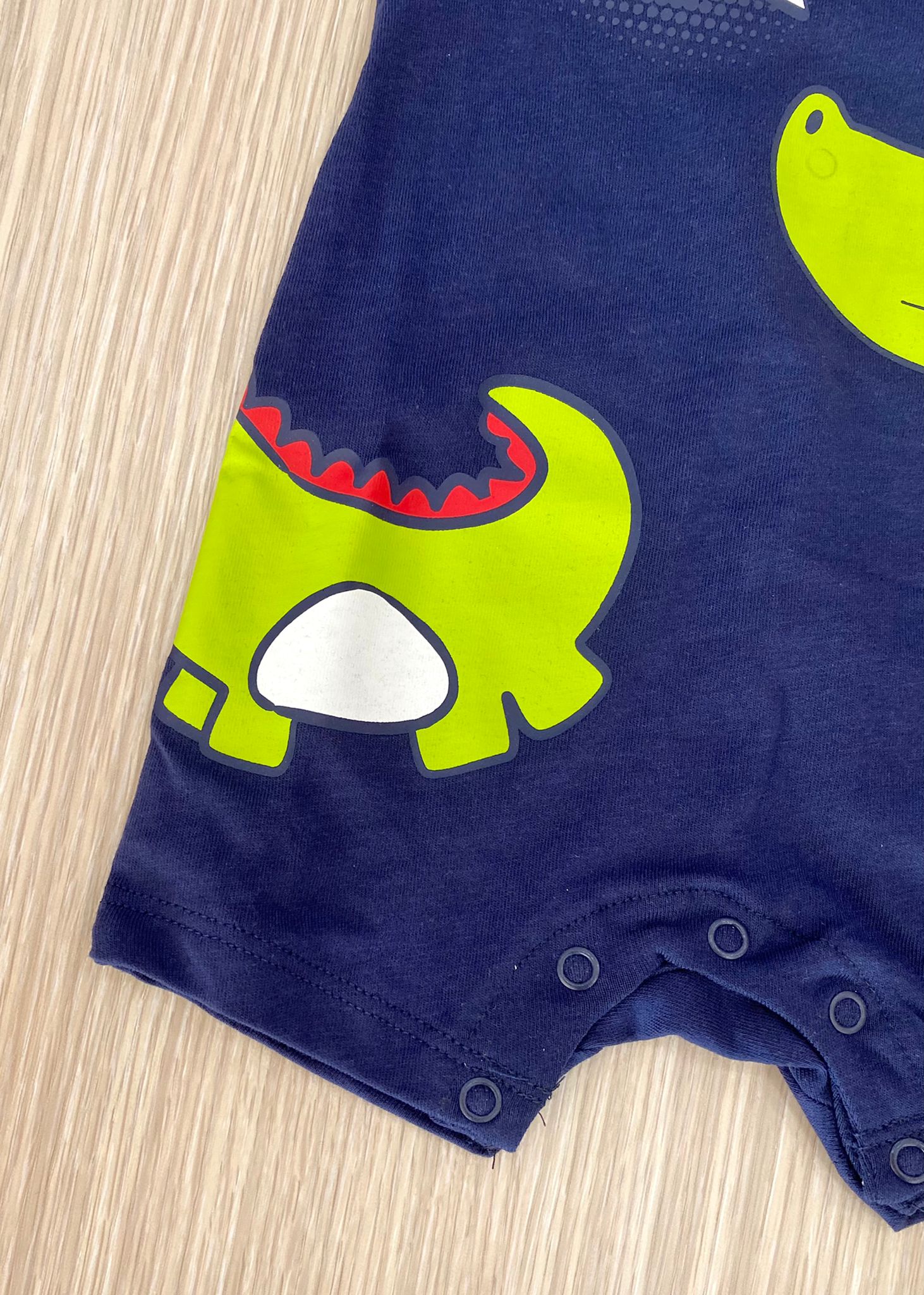 Pagliaccetto neonato/bambino in cotone, di colore blu con stampa di colore verde.