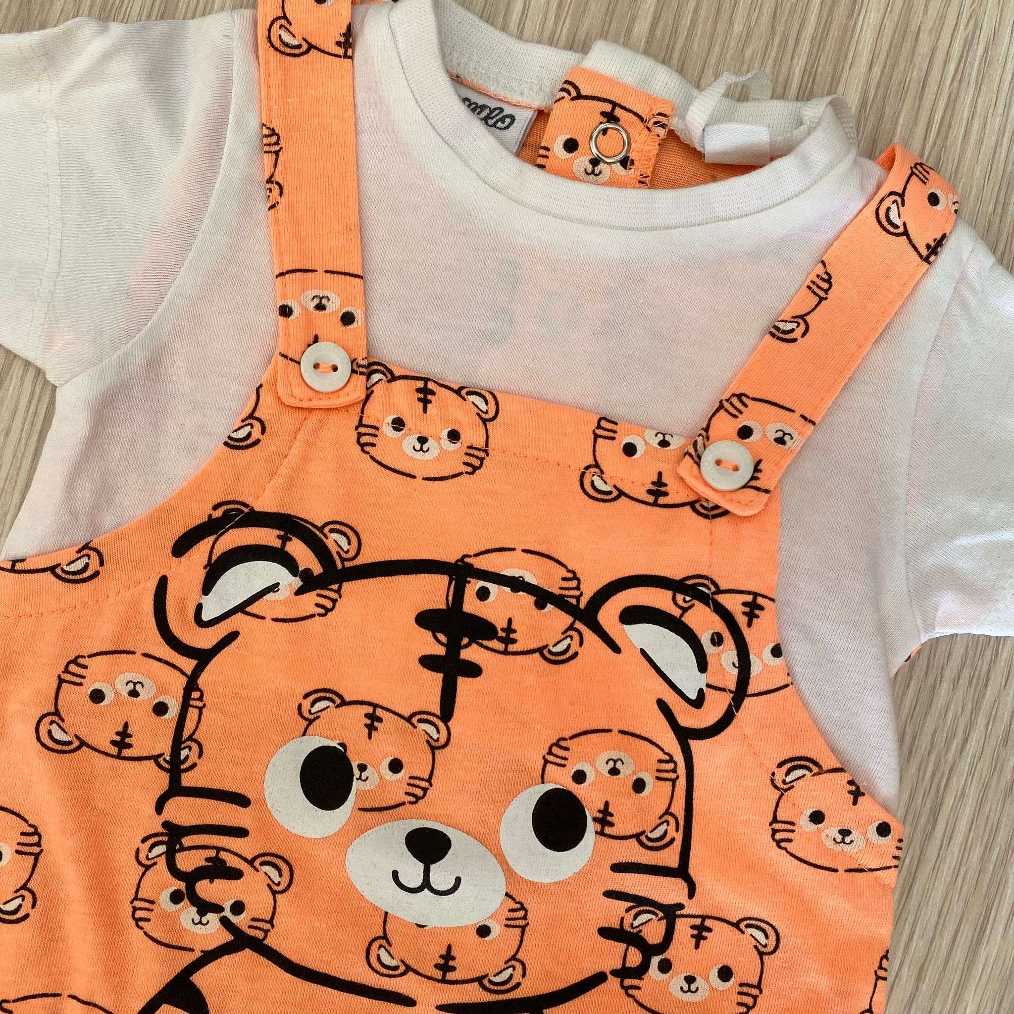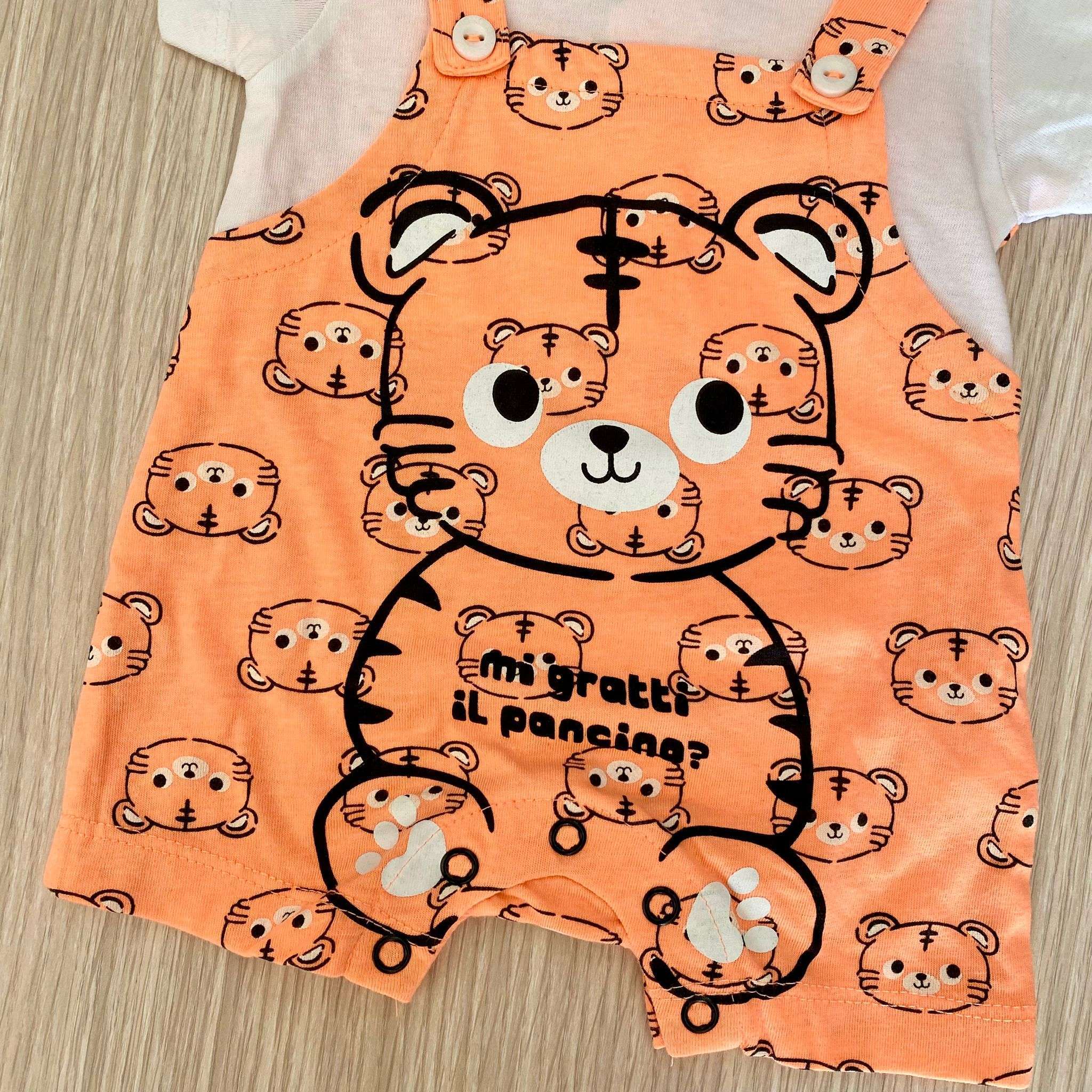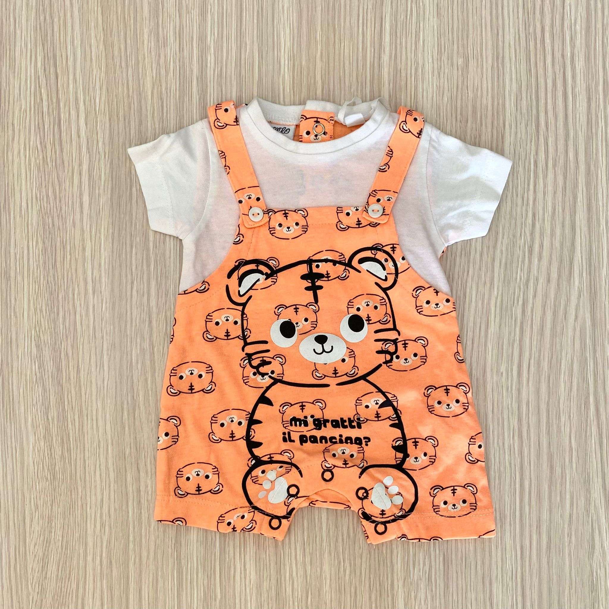 Pagliaccetto neonato/bambino in cotone, di colore arancio fluo e nero, con dettaglio di finte bretelle.