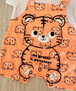 Pagliaccetto neonato/bambino in cotone, di colore arancio fluo e nero, con dettaglio di finte bretelle.