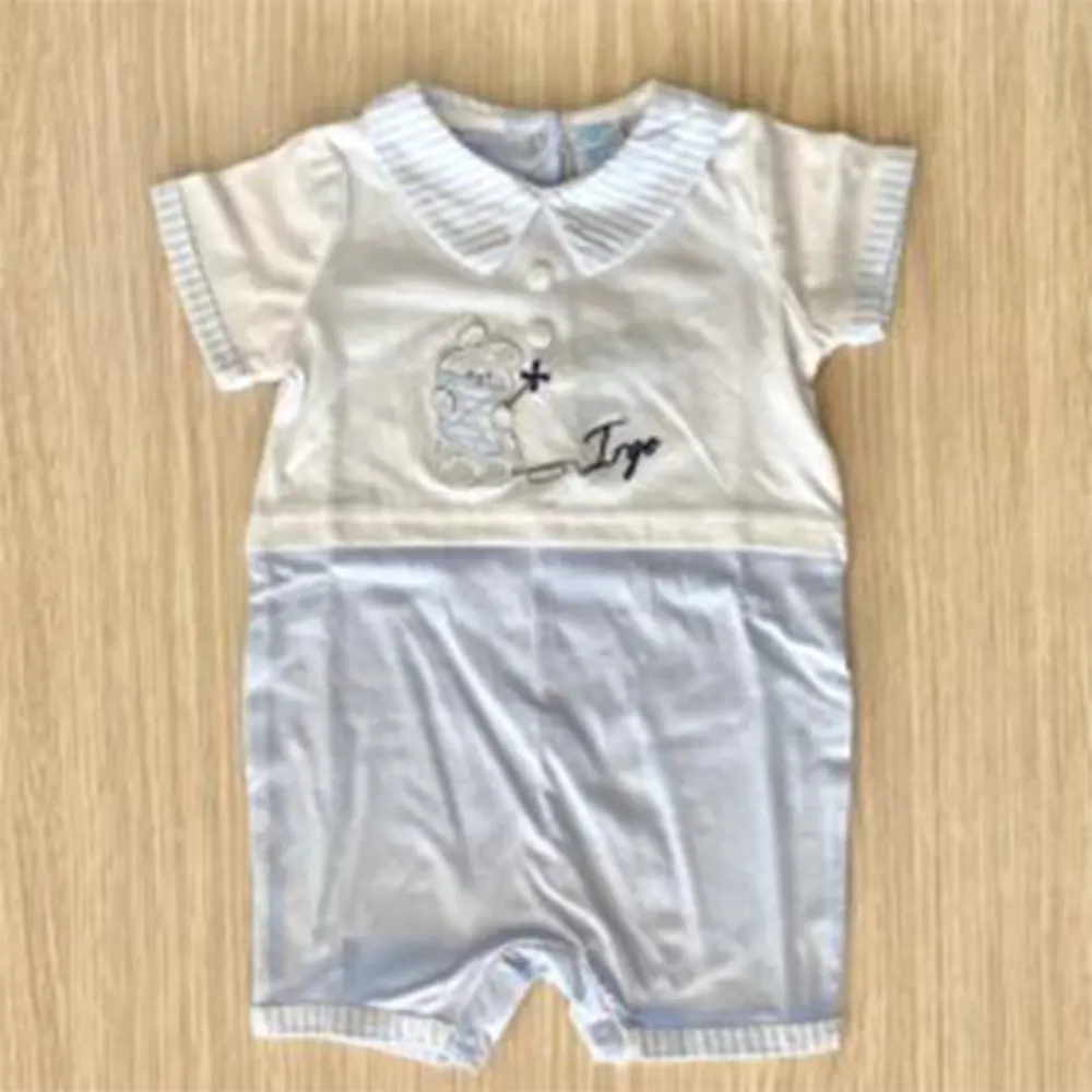 Pagliaccetto neonato/bambino in cotone di colore bianco e azzurro, con ricamo in rilievo.