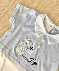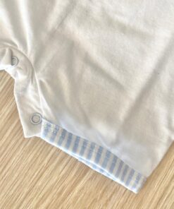 Pagliaccetto neonato/bambino in cotone di colore bianco e azzurro, con ricamo in rilievo.