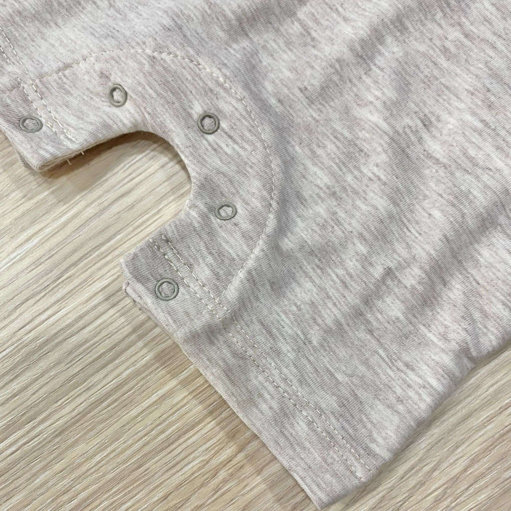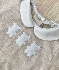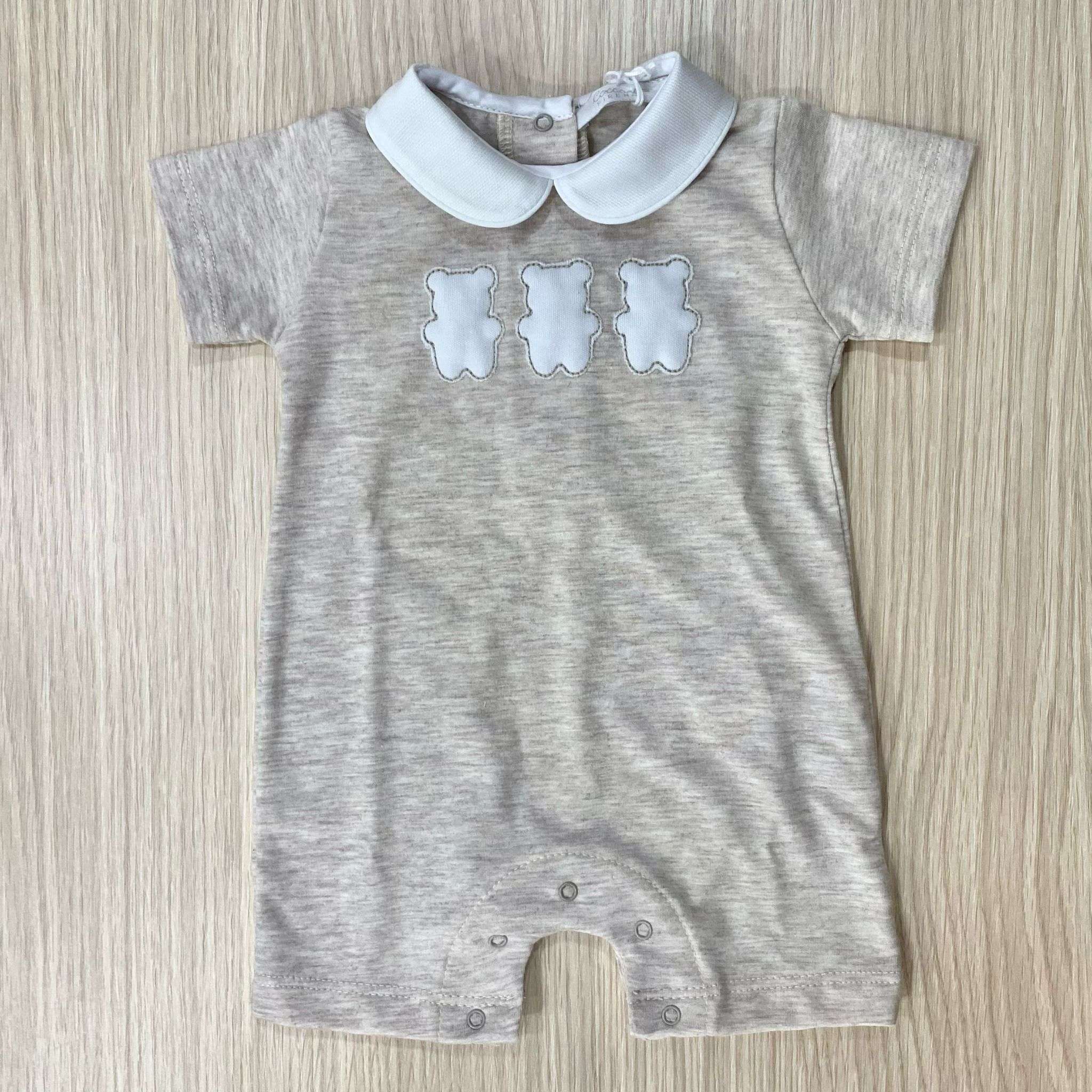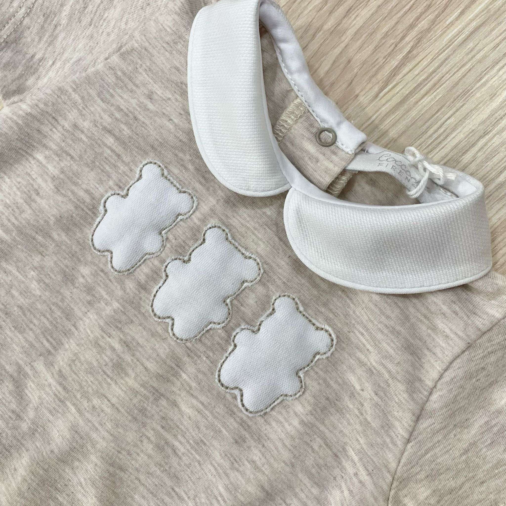 Pagliaccetto neonato in cotone, di colore sabbia e bianco, con disegno in rilievo.