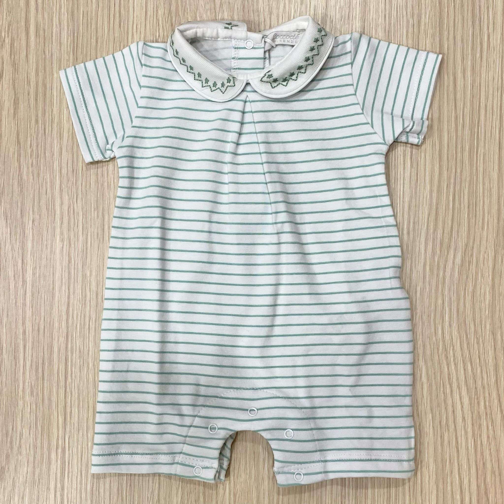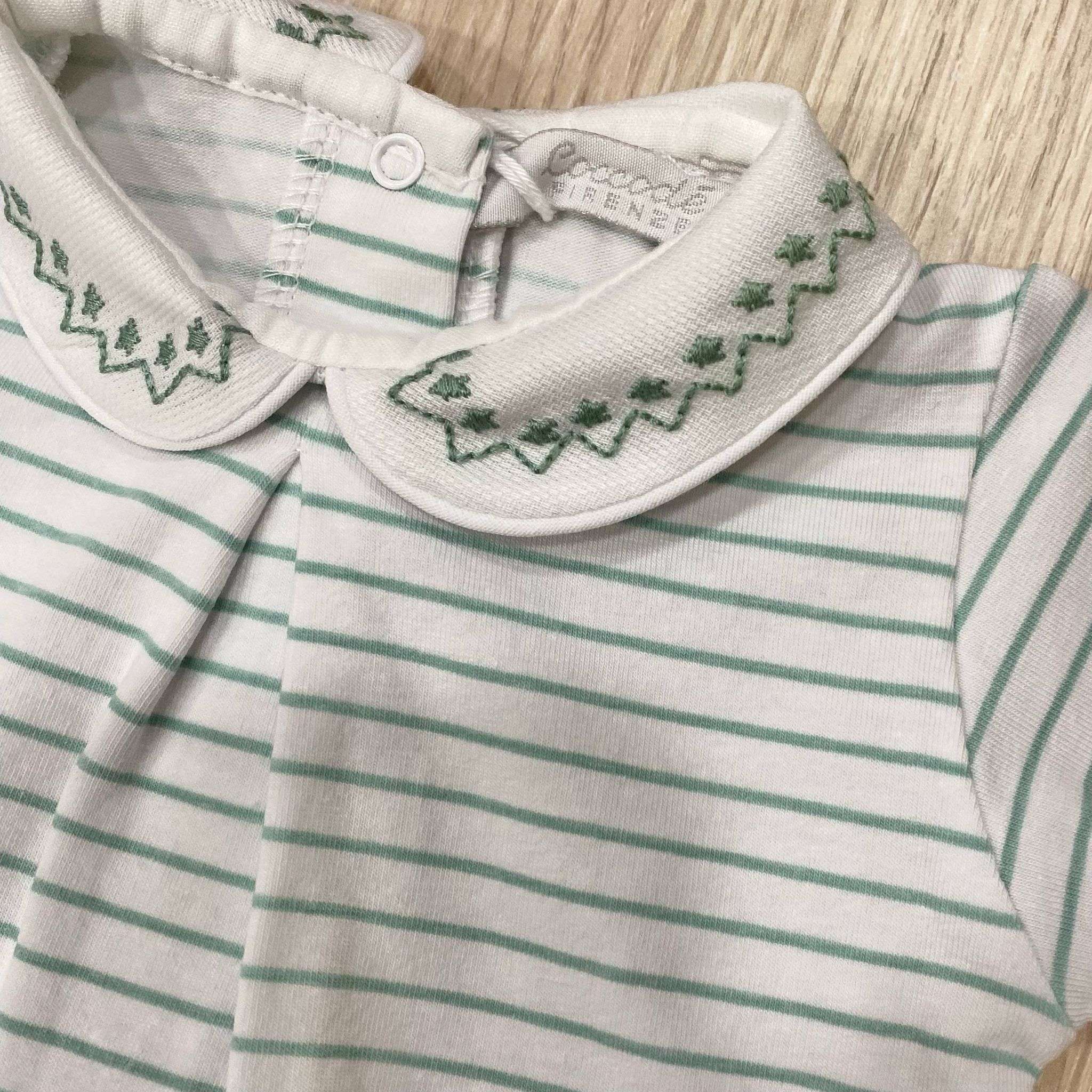Pagliaccetto neonato in cotone, di colore verde acqua e bianco, con disegno ricamato.