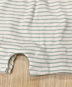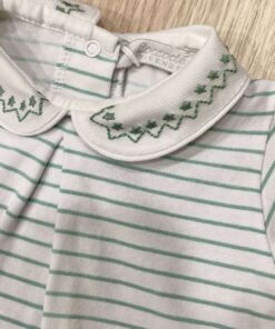 Pagliaccetto neonato in cotone, di colore verde acqua e bianco, con disegno ricamato.