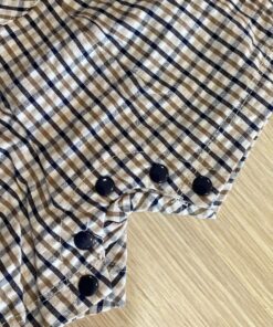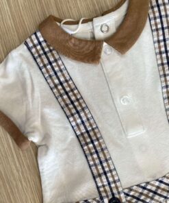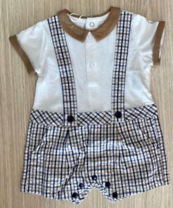Pagliaccetto neonato in cotone, di colore bianco, blu, marroncino, con dettaglio di finta salopette.