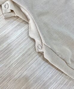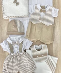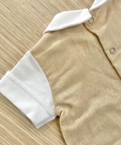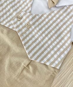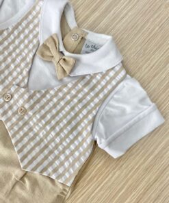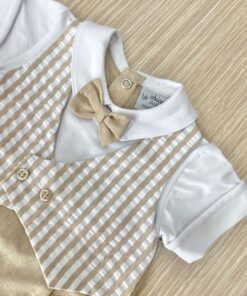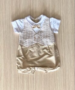 Pagliaccetto neonato in lino di cotone, di colore bianco e beige, con applicazione di bottoncini, papillon e finto gilet.