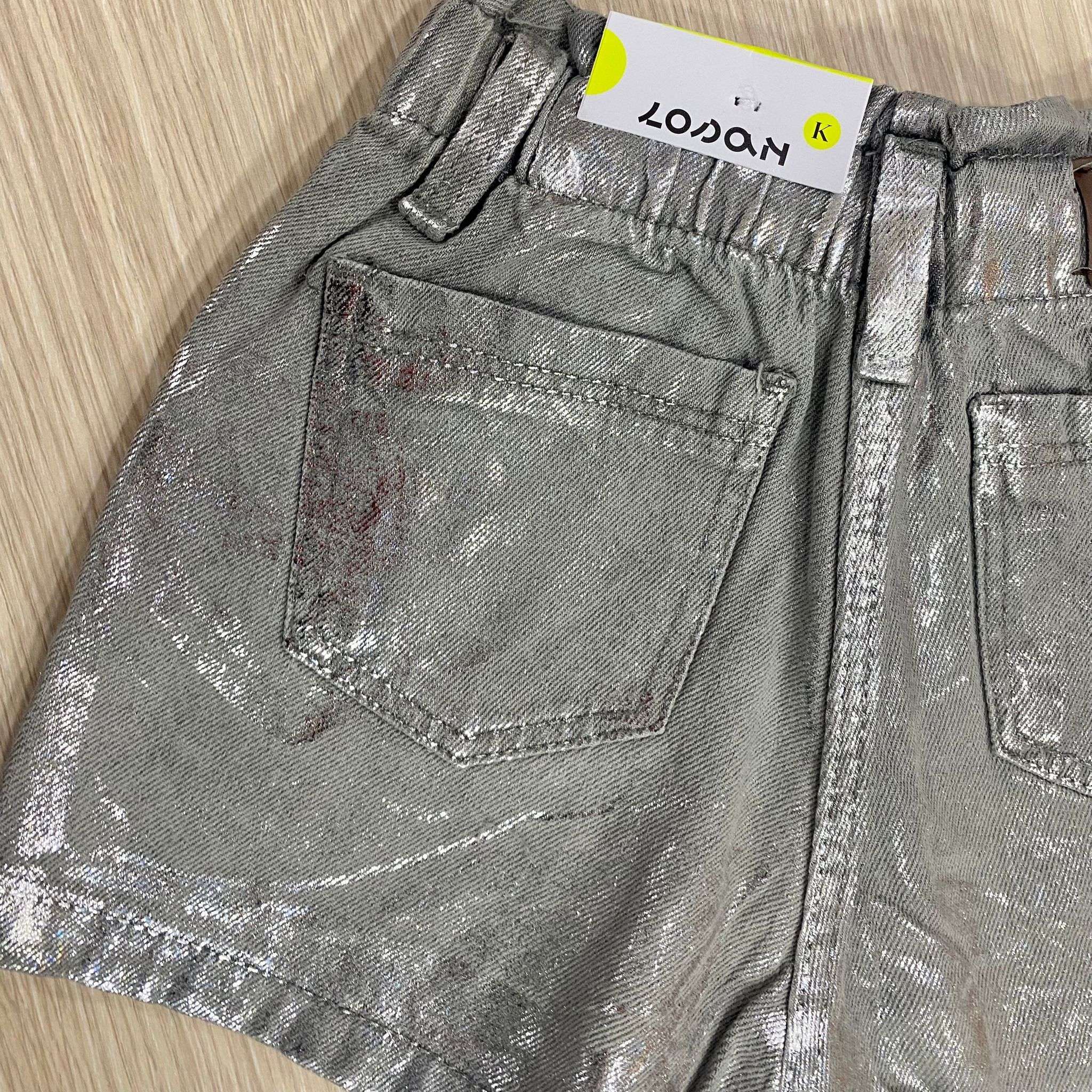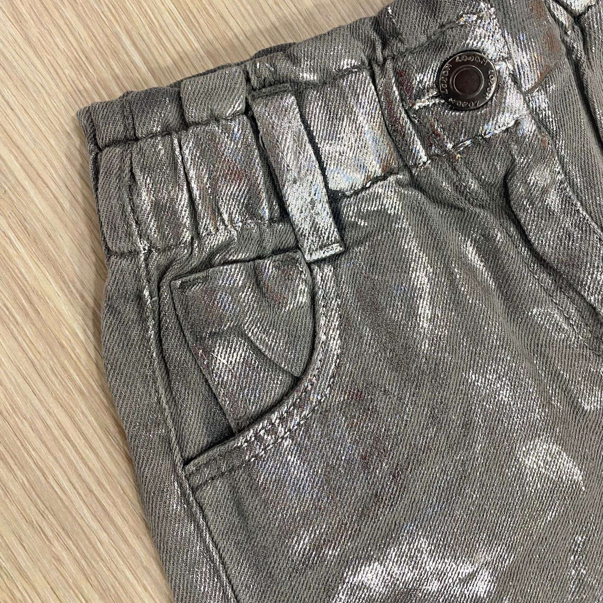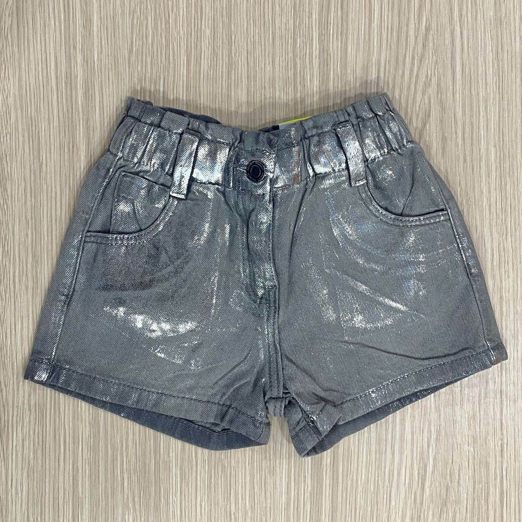 Pantaloncino bambina in denim di colore grigio, con tasche, con dettaglio di elastico regolabile all’interno.
