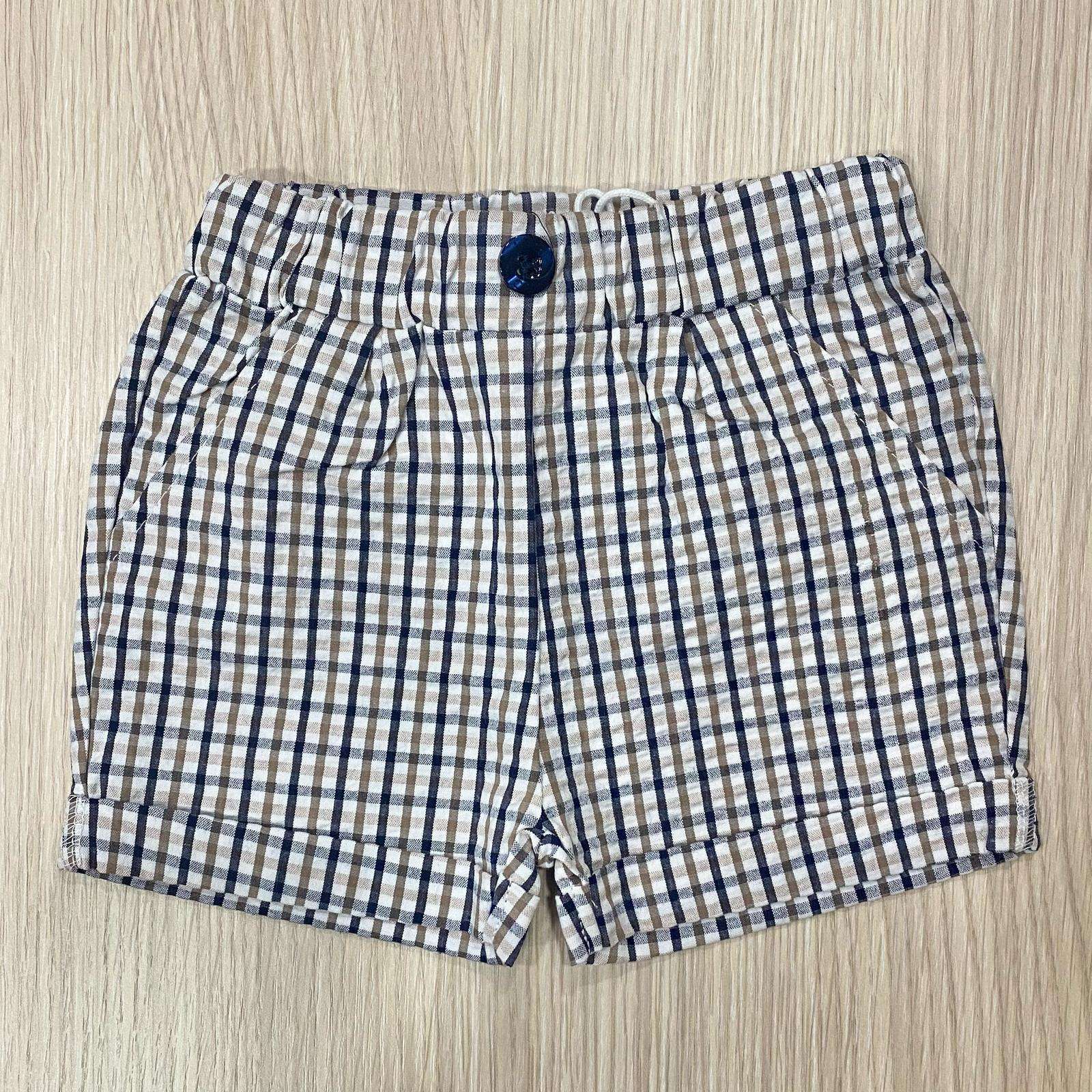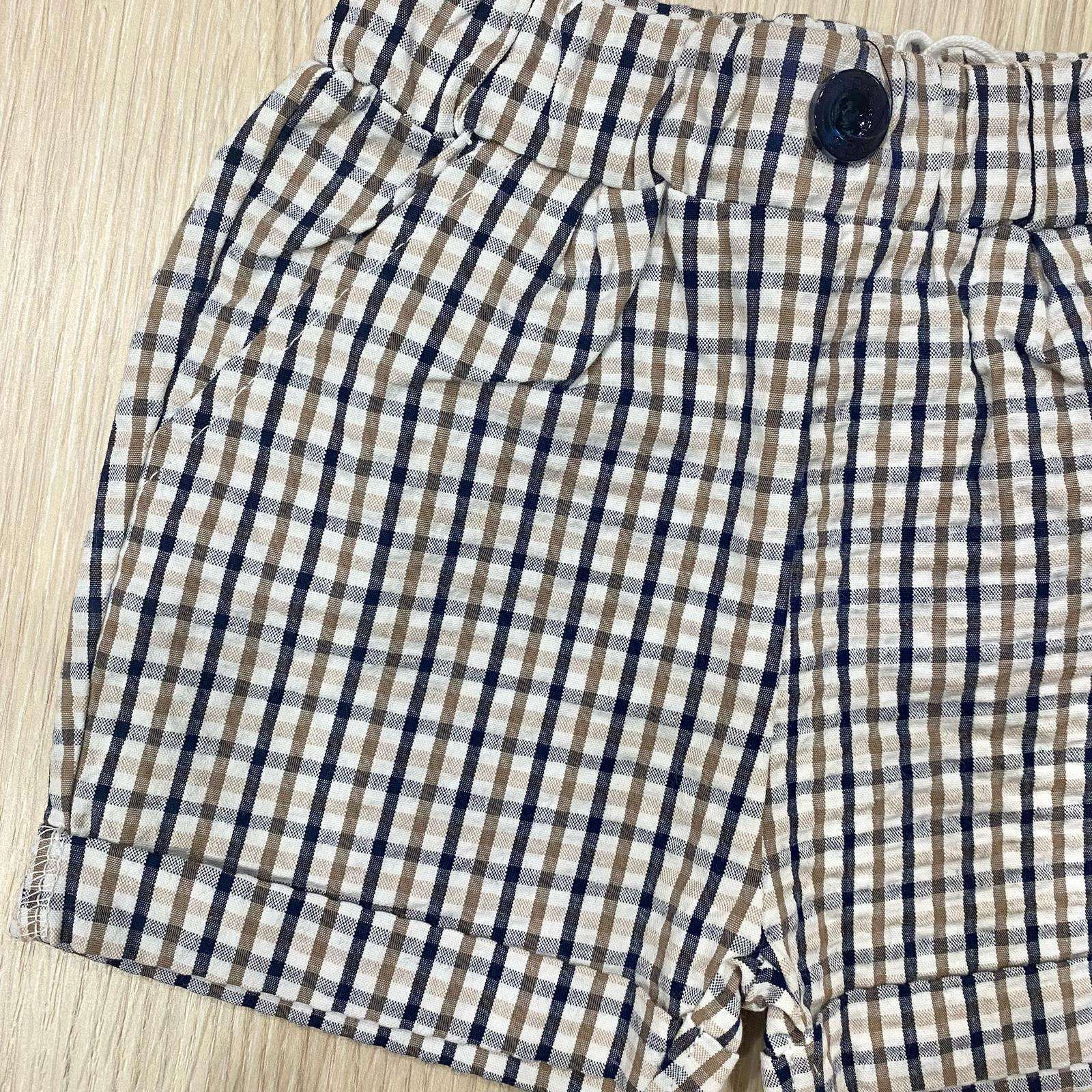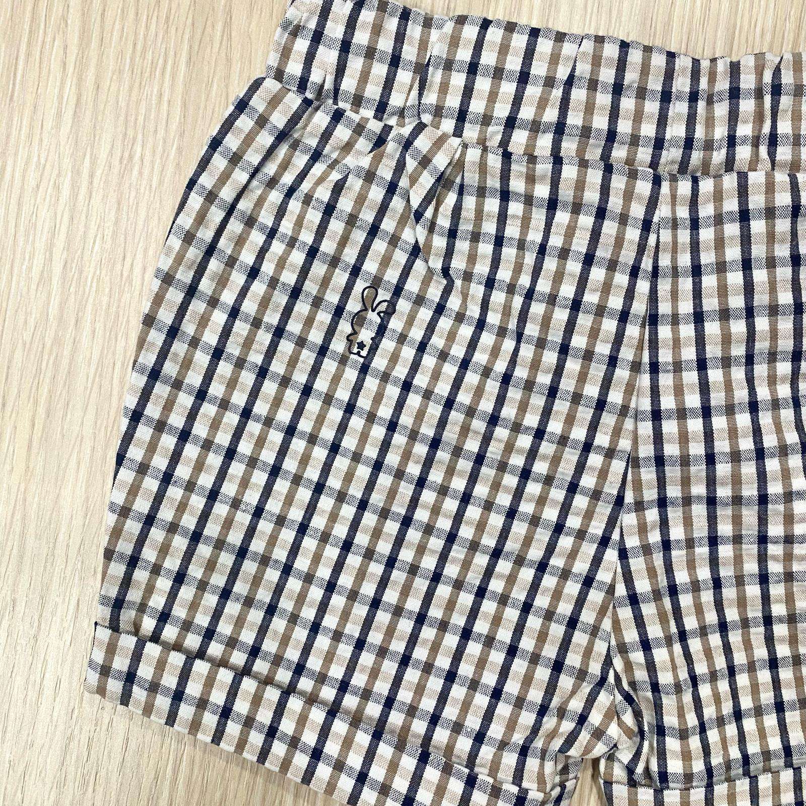 Pantaloncino neonato/bambino in cotone, di colore panna, beige e blu. Pantaloncono con elastico in vita, dettaglio di finto bottoncino.