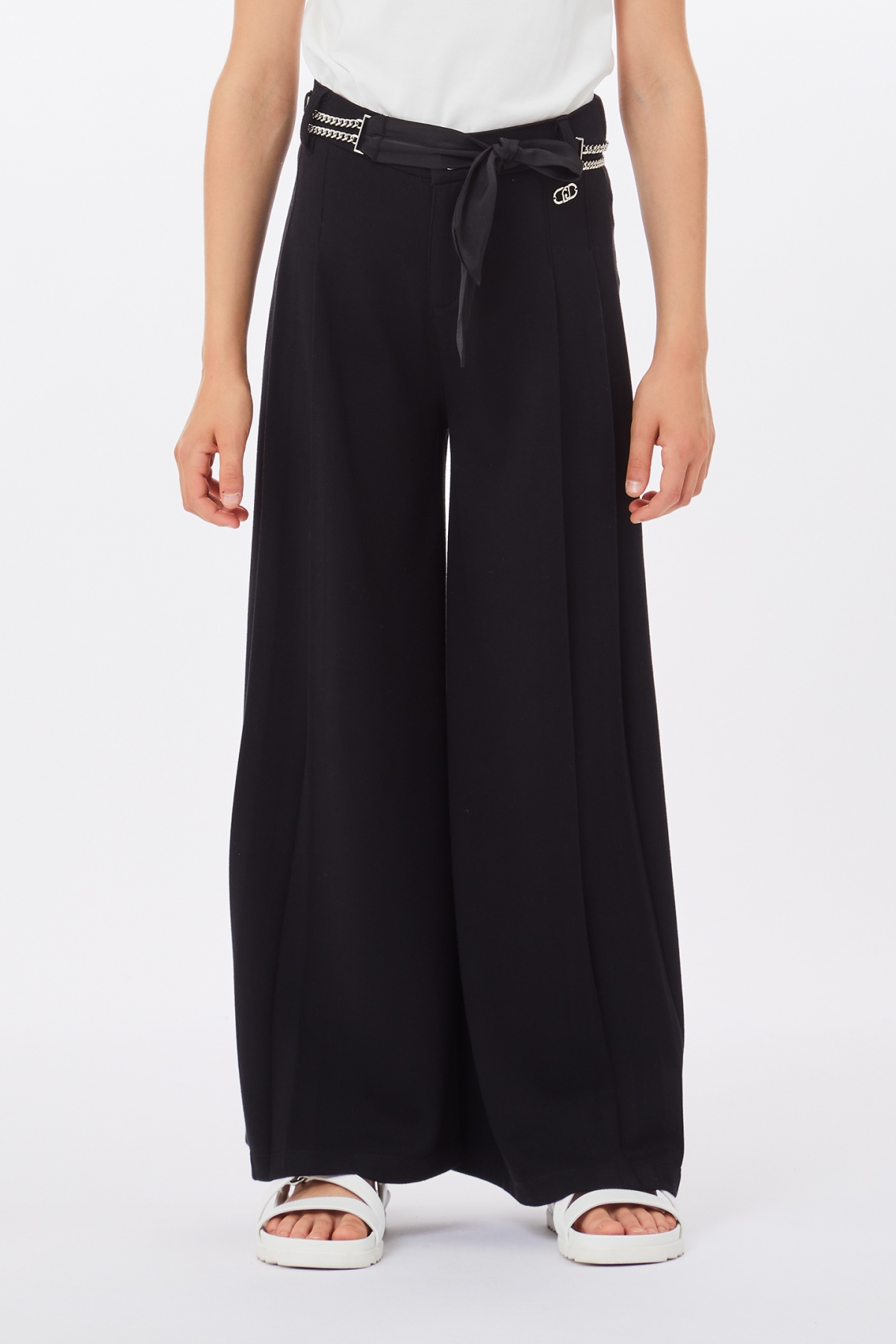 Pantalone con cintura in tessuto e catenelle.