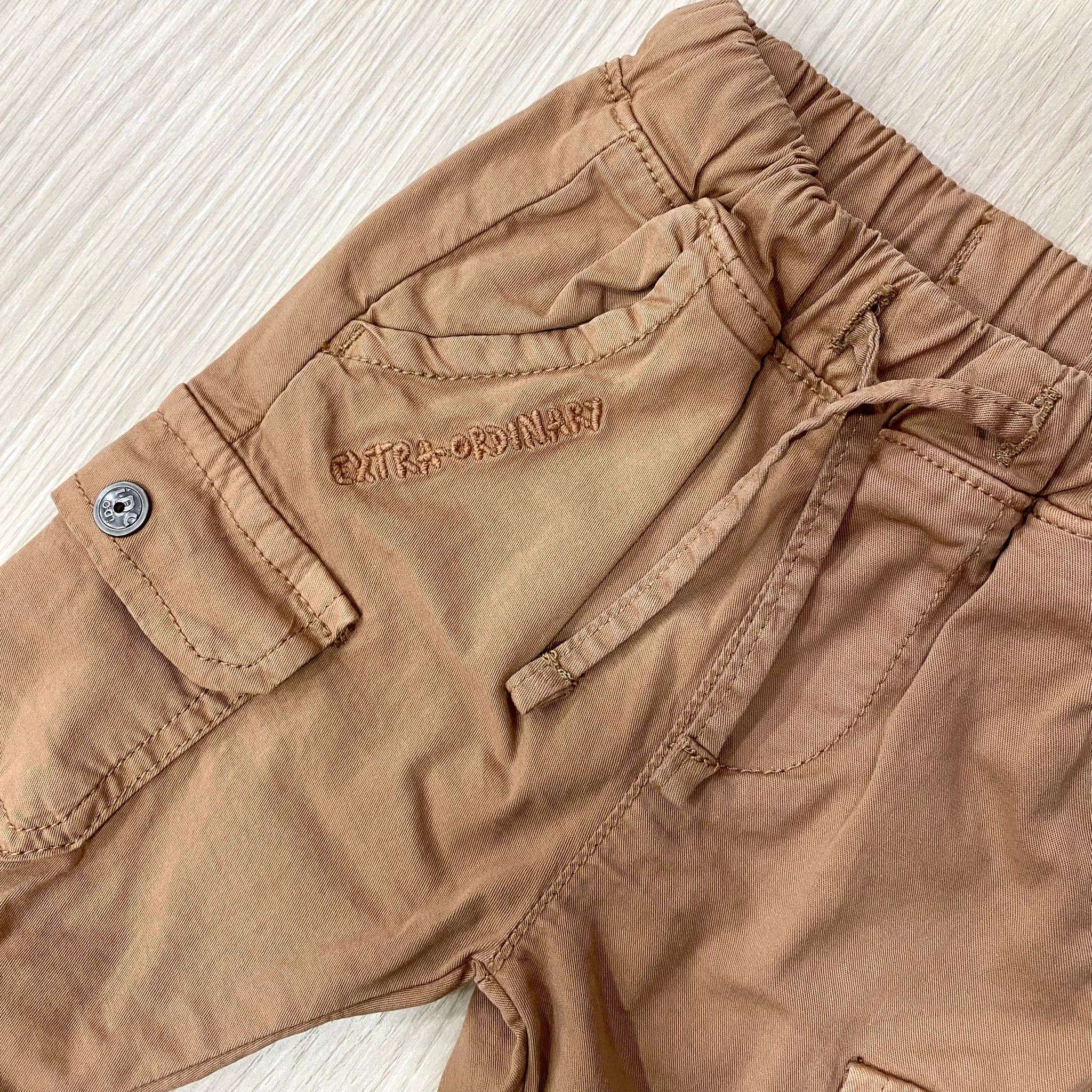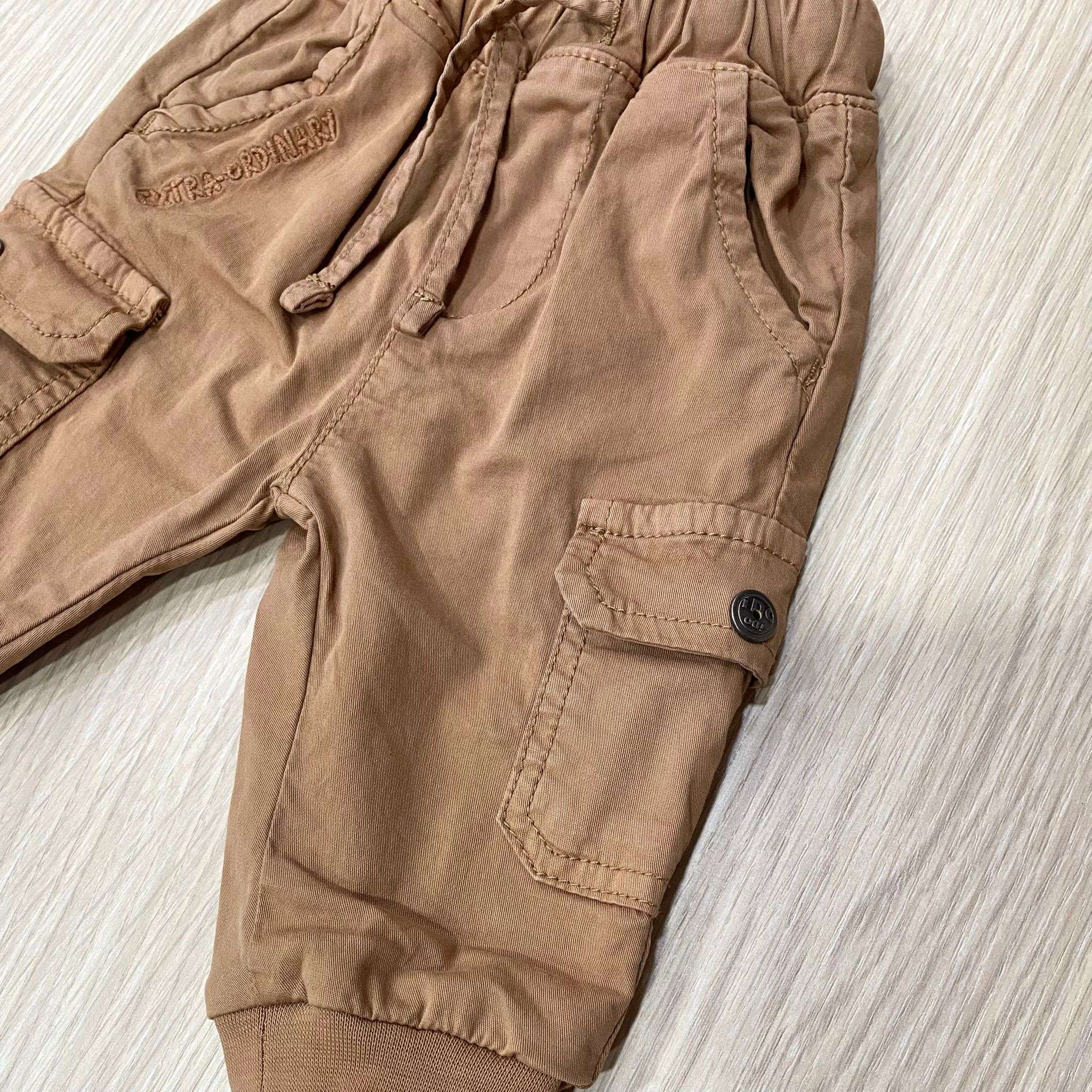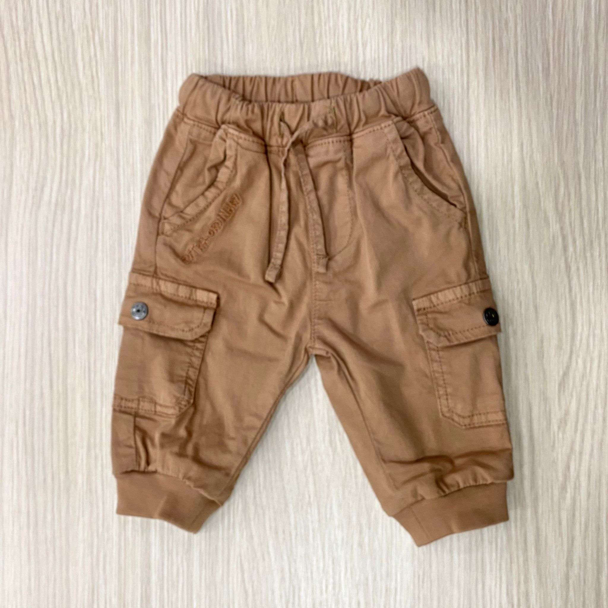 Cargo neonato/bambino in cotone, di colore nocciola, con tasche laterali ed elastico regolabile. Cargo con polsini. Ideale per periodo primavera/estate.