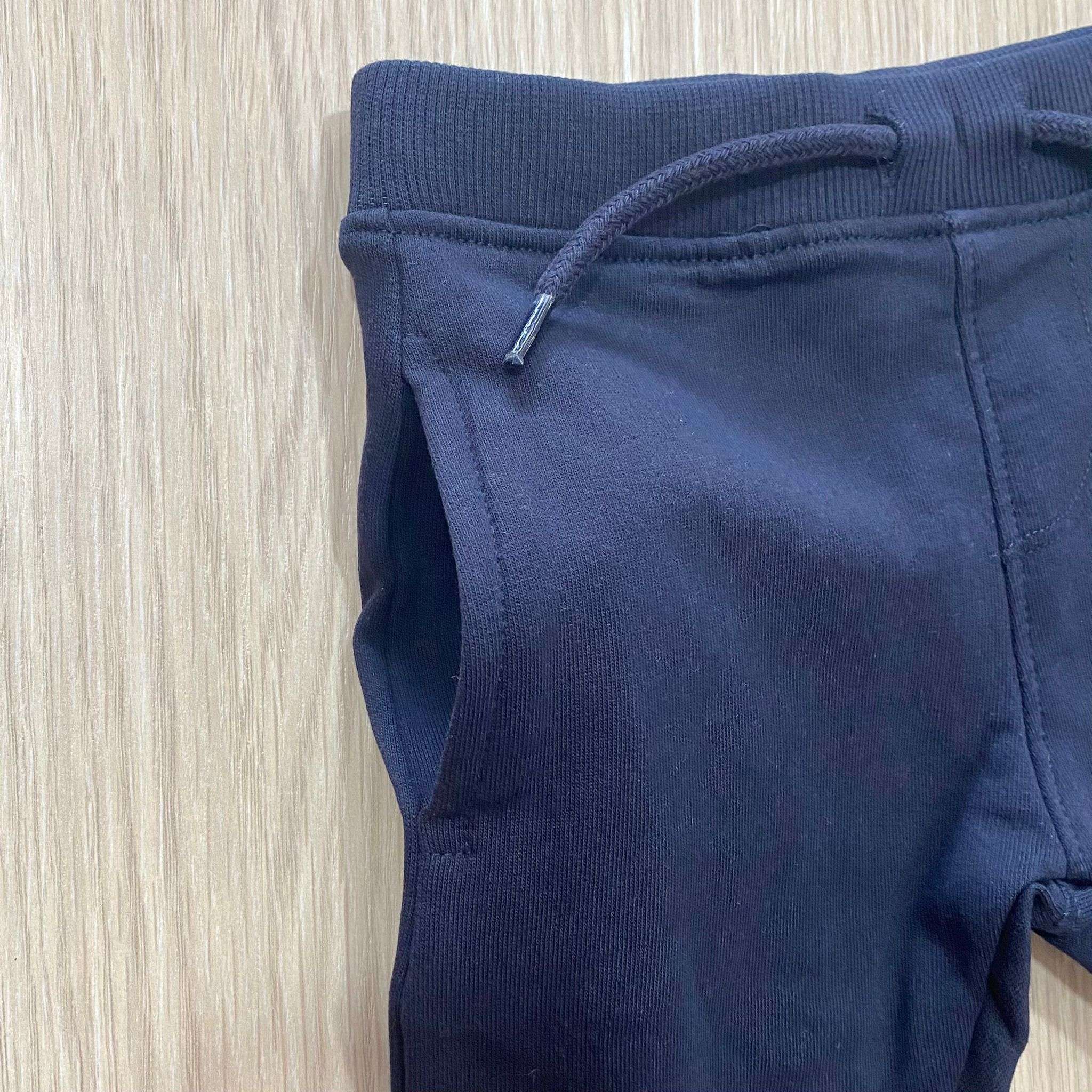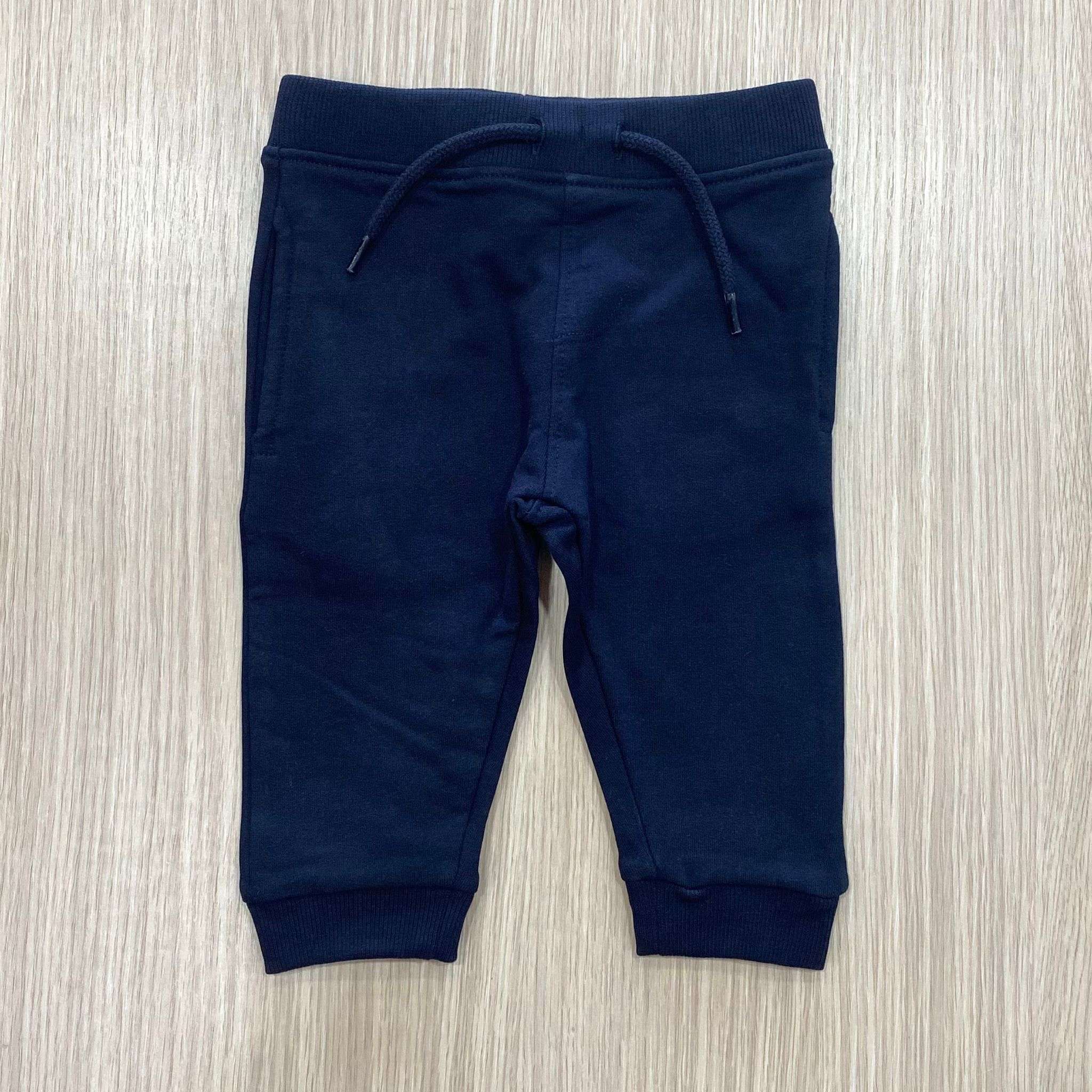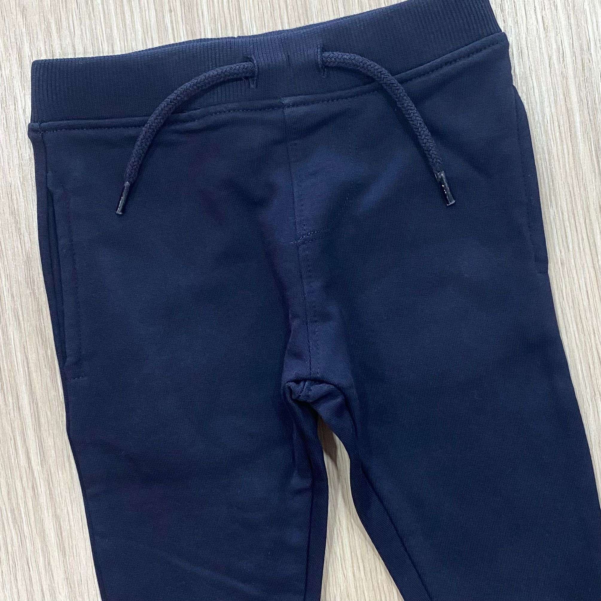 Pantalone di tuta neonato/bambino in cotone felpato garzato, di colore blu, con elastico regolabile all’interno e con cordino regolabile all’esterno.