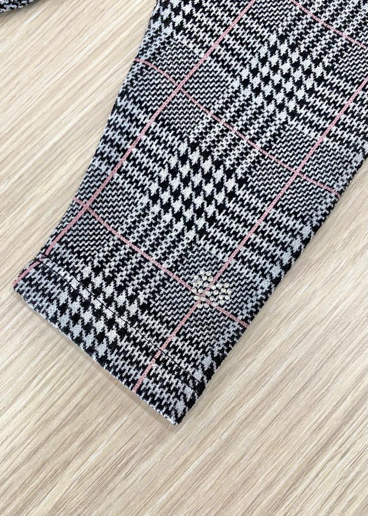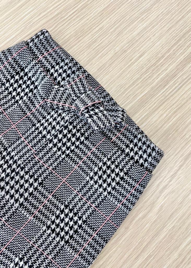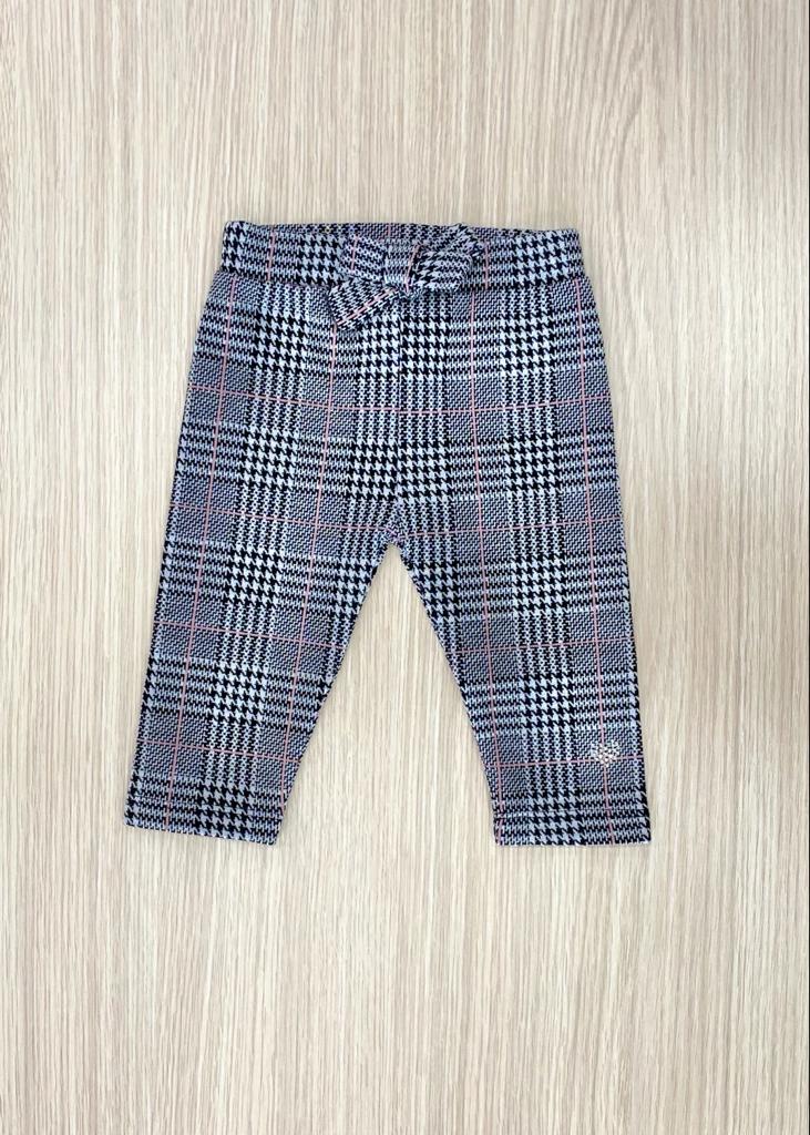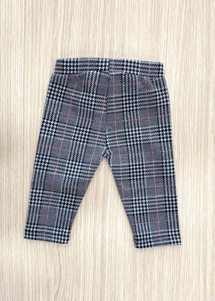 Pantalone/leggings neonata/bambina in morbido e caldo tessuto, di colore grigio con dettagli di colore nero e rosa, applicazione di fiocchetto e strass.
