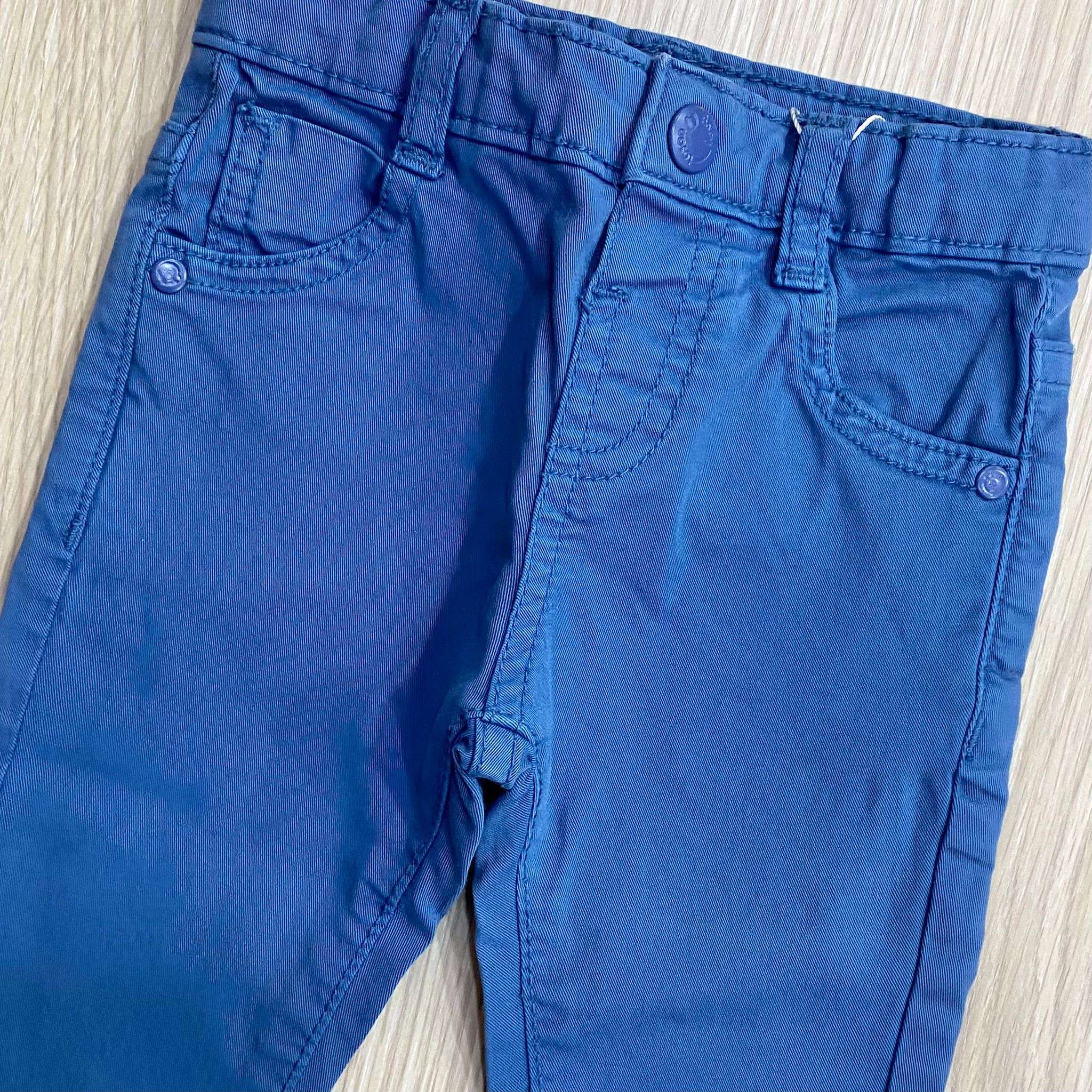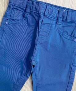 Pantalone neonato/bambino, in cotone, di colore azzurro o blu, dalla vestibilità slim. Cinque tasche. Regolazione interna in vita e pulsante.