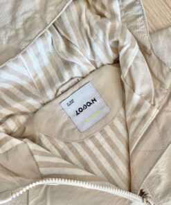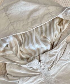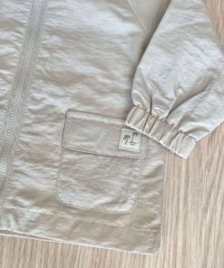 Giubbottino modello parka neonato/bambino in cotone, di colore beige e panna, con fodera in cotone. Parka con cappuccio e dettaglio di tasche.