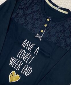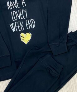 Pigiama bambina in caldo cotone, di colore nero, con stampa di colore bianco e dettaglio di pizzo.
