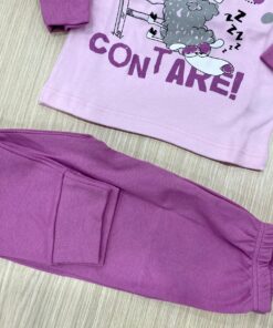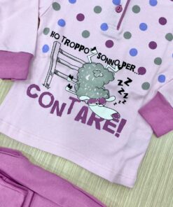 Pigiama bambina in caldo cotone, di colore lilla e rosa, con applicazione di bottoncini.
