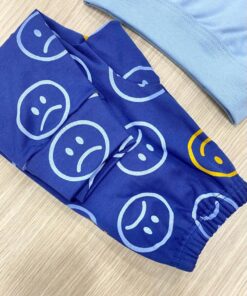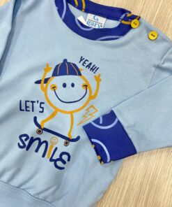 Pigiama bambino in morbido caldo cotone, di colore azzurro e blu, con stampa di vari colori.
