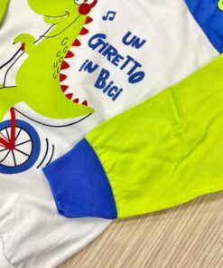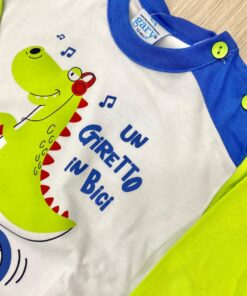 Pigiama bambino in morbido cotone, di colore azzurro e bianco, con dettagli di colore verde, applicazioni di bottoncini. Pigiama con polsini.